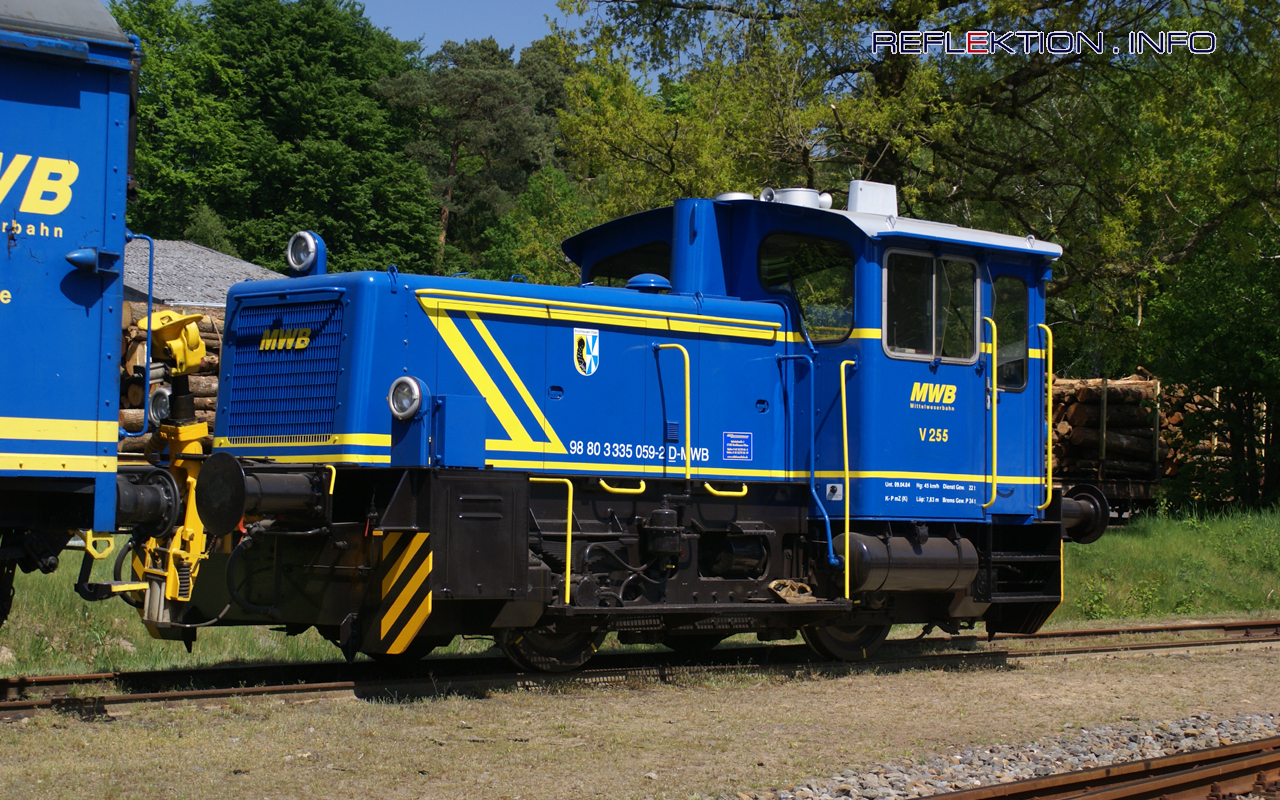 MITTELWESERBAHN V 255 Die 1999 gegründete Mittelweserbahn GmBH -MWB- aus Bruchhausen-Vilsen unterhält mit 145 Mitarbeitern über 40 normalspurige Lokomotiven aller Leistungsklassen. Das Spektrum reicht von Kleinlokomotiven bis hin zu 6.400 kW starken Hochleistungselektrolokomotiven. Die MWB erbringt Verkehrsleistungen in Deutschland und den Nachbarländern sowohl im Güterverkehr als auch bei Bauzugleistungen. Die hervorragend gepflegte V 255, die ehemalige DB-Köf III 335 059-2 (333 059-4) wurde 1969 von Gmeinder gebaut und ist neben 2 weiteren Köf III seit 2007 im Bestand der MWB.