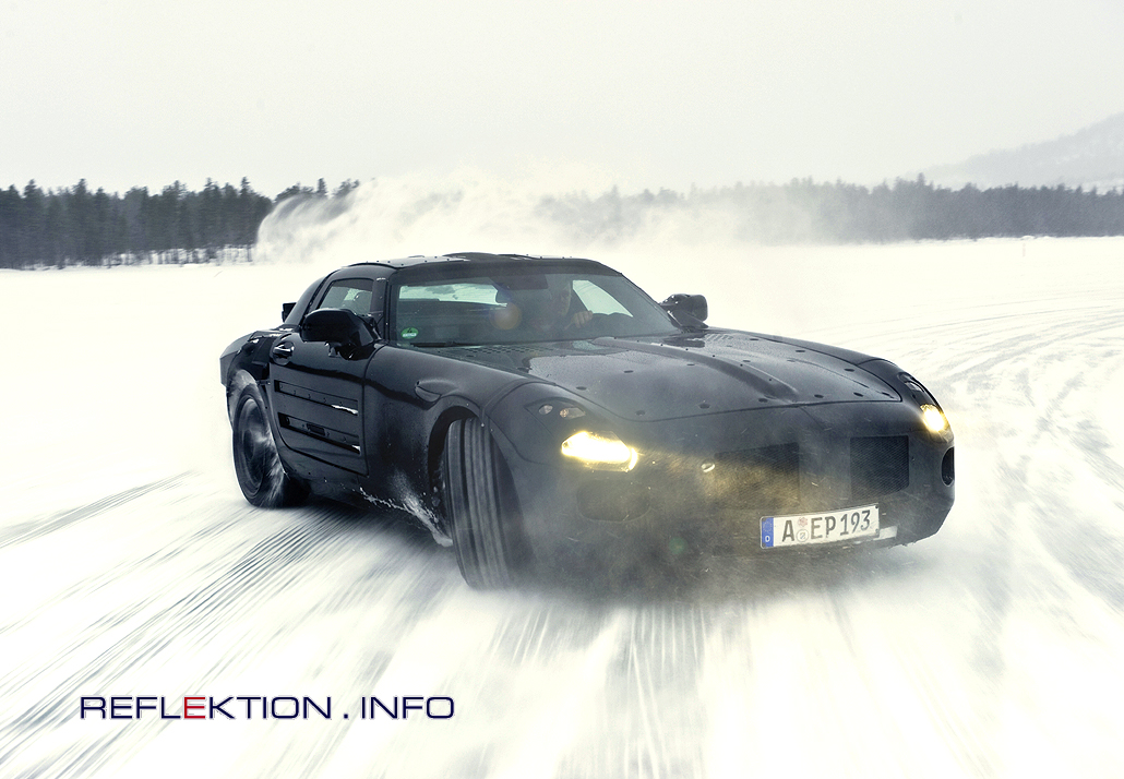 MERCEDES-BENZ SLS AMG Erstmals in der über vierzigjährigen Unternehmensgeschichte präsentiert Mercedes-Benz’ Haustuner AMG ein eigenständig entwickeltes Fahrzeug, den Mercedes-Benz SLS AMG. Obwohl komplett abgeklebt und sonstwie getarnt macht er schon eine Menge her - vielleicht wird der SLS nicht ganz so elegant wie sein Vorfahr, das 300 SLR-Uhlenhaut-Coupé (mehr zum Uhlenhaut-Coupé....) Dafür begeistert der Supersportwagen mit einzigartiger Technik: Aluminium-Spaceframe-Karosserie mit Flügeltüren, AMG 6,3-Liter-V8-Frontmittelmotor mit 420 kW / 571 PS Höchstleistung und Siebengang-Doppelkupplungsgetriebe in Transaxle-Anordnung sowie Sportfahrwerk mit Aluminium-Doppelquerlenkerachsen. Das maximale Drehmoment von 650 Newtonmetern erreicht der Achtzylinder-Saugmotor bei 4750 Umdrehungen. Von null auf 100 km/h reichen 3,8 Sekunden, bei 315 km/h ist der höchste Vortrieb erreicht. Die ideale Gewichtsverteilung von 48 zu 52 Prozent zwischen Vorder- und Hinterachse und der tiefe Fahrzeugschwerpunkt betonen das kompromißlose Sportwagen-Konzept. Bei sparsamer Fahrweise soll der Durchschnittsverbrauch für 100 km bei grünen 13 Litern liegen - aber wer will denn mit einem Flügeltürer sparsam fahren?