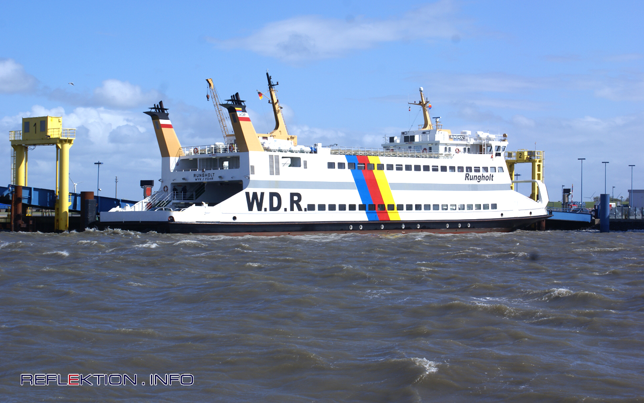 WYKER DAMPFSCHIFFREEDEREI - FÄHRSCHIFF RUNGHOLT Seit Mitte des 16. Jahrhunderts gibt es regelmäßige Fährschiffverbindungen von Dagebüll zu den nordfriesischen Inseln. 1885 wurde in Wyk auf Föhr die WYKER DAMPFSCHIFFREEDEREI gegründet. Mit 7 Schiffen und rund 170 Mitarbeitern werden heute die Linien nach Föhr, Amrum, Schlüttsiel, Hooge; Langeneß unterhalten. Die Auto- und Personenfähre RUNGHOLT ist 1992 auf der Husumer Schiffswerft gebaut worden. Einige Daten: Rungholt, Bj 1992 BRZ 2265 Passagiere 1190, PKW 53 Länge 67,84 m, Breite 14,80 m, max. Tiefgang 1,96 m Maschinen 2 MaK-Motoren Leistung 1.920 kW Geschw. 12,5 Knoten, 24 km/h