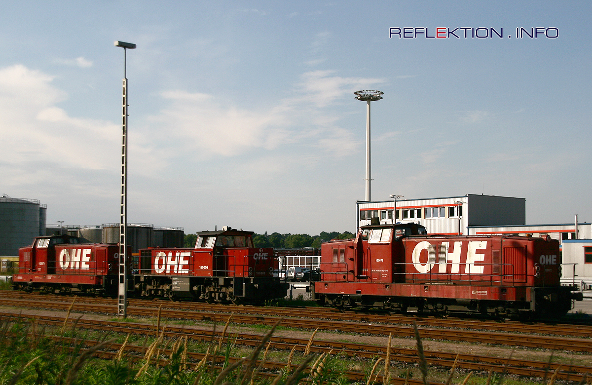 OSTHANNOVERSCHE EISENBAHNEN im Hamburger Hafen Nach einem drastischen Frachtumschlagsrückgang im Hamburger Hafen geht es nun wieder kräftig aufwärts im Containerverkehr. Die OHE sind jetzt mit 3 ihrer großen Dieselloks, der (v.l.n.r.) 120071, 150002 und 120072, im Containerverkehr im Einsatz. Aber ab samstags 18 Uhr ist dann Wochendendruhe.