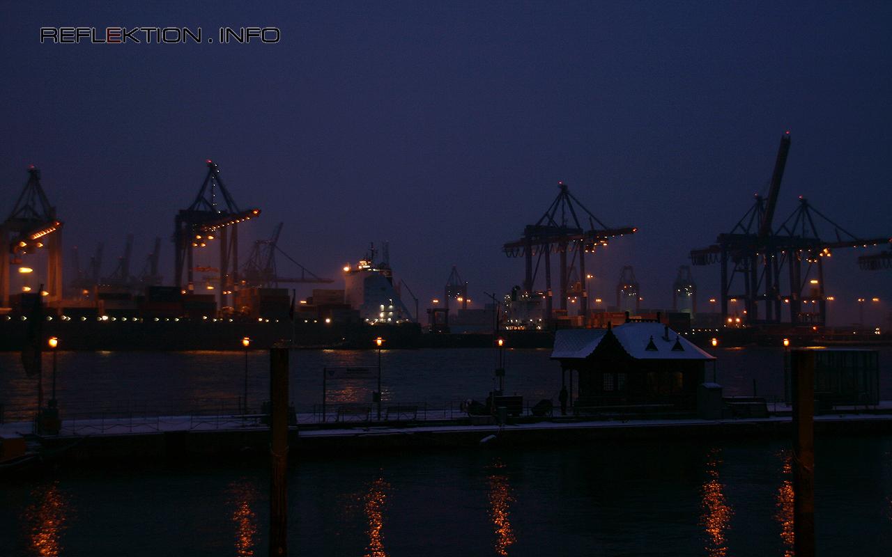MUSEUMSHAFEN OEVELGÖNNE Bei einbrechender Dunkelheit und etwas vorweihnachtlichem Schneefall geht der Blick vom nördlichen Elbufer bei Hamburg-Neumühlen über den winterlich leeren Kai des Museumshafens Oevelgönne hinüber auf das südliche Elbufer am Athabaskakai mit dem Containerterminal Buchardkai.