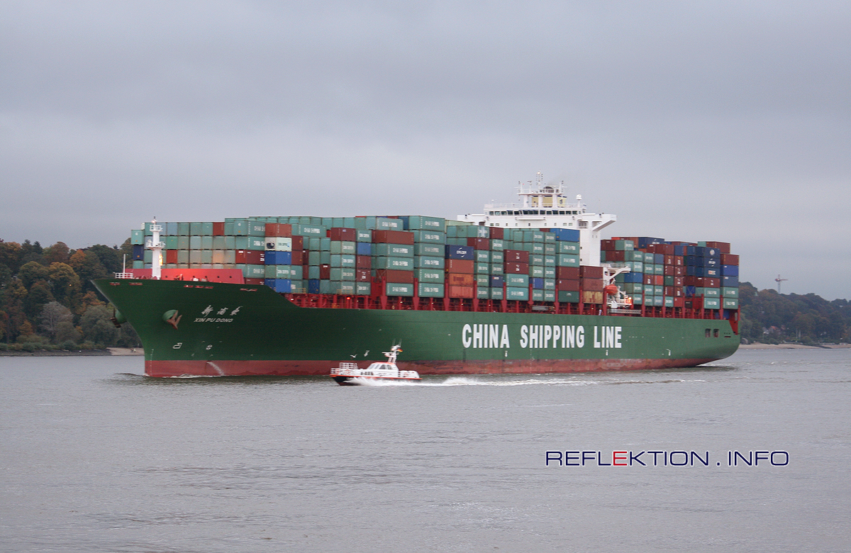 Containerfrachter CSL XIN PU DONG Die 2003 gebaute XIN PU DONG der Reederei CHINA SHIPPING LINE verkehrt im festen Umlauf Asien - Europa und galt damals als eines der größten Schachteldampfer weltweit. Das Schiff ist 280 Meter lang und 40,30 Meter breit. Voll beladen mit 5618 20-Fuß-Containern beträgt der größte Tiefgang 13 Meter. Der Heimathafen des 25 Knoten ( rund 49 km/h) schnellen Schiffes ist Shanghai.