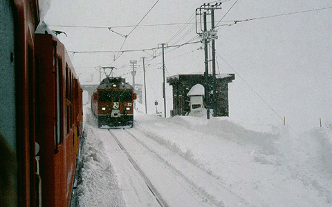 BERNINA BAHN - OSPIZIO BERNINA Bei starkem Schneefall erwartet auf 2.253 Meter ü.M. in der Station OSPIZIO BERNINA der BERNINA BAHN der Zug der RHÄTISCHEN BAHN nach Tirano die Einfahrt des Gegenzuges nach St. Moritz mit dem Triebwagen ABe 4/4 52 an der Spitze.