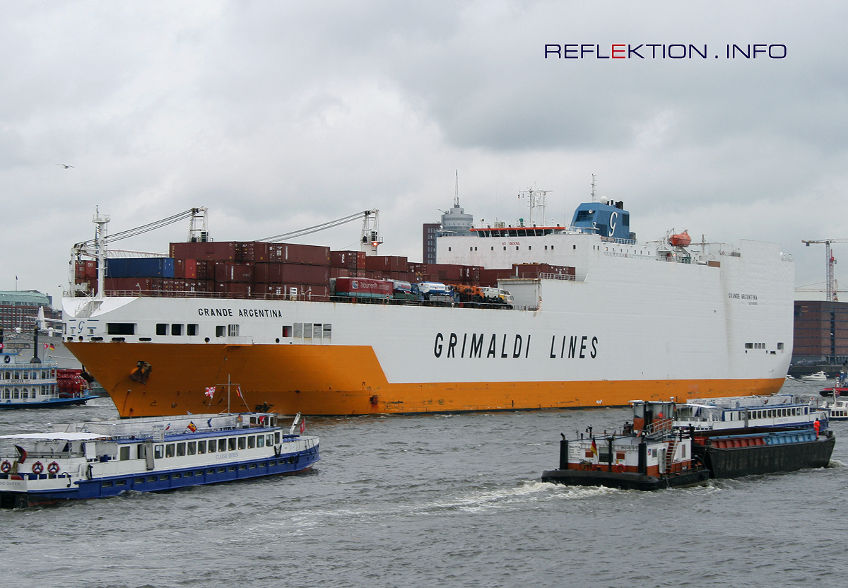 GRANDE ARGENTINA Die GRANDE ARGENTINA befährt für die italienische Reederei GRIMALDI LINES im Linienverkehr die Route Hamburg - Afrika. Der ConRo-Frachter transportiert hauptsächlich Autos nach Abidjan in der Elfenbeinküste, Lagos, Monrovia, Cotounou und Tema Die Verladung der Fahrzeuge erfolgt meistens mit sogenannten Pushern, gummibewehrten Fahrzeugen, die die Exportautos Stoßstange an Stoßstange an Bord schieben. Solch Manöver ist am rechten Bildrand zu erkennen. Beliebt sind auch gedoppelte Fahrzeuge, LKW’s, die mit LKW’s beladen sind. Das Vorderdeck der GRANDE ARGENTINA ist voll von Gedoppelten. Die GRANDE ARGENTINA und ihre 8 Schwesterschiffe verfügen über bordeigene Krananlagen und sind somit unabhängig von Containerterminal und Kaikränen. Technische Daten: Länge: 214,00 m Breite: 32,25 m Tiefgang: 9,70 m BRZ: 56.768 Tonnen Geschwindigkeit: 20,0 Kn Maschine: Sulzer- 18.280 Kw Baujahr: 2003 bei Fincantieri-Cantieri Navali Italiani S. p. A. (Triest, Italien) Eigner: Grimaldi-Gruppe Heimathafen: Göteborg Passagiere: 12 Personen Besatzung: 22 Personen Ladekapazität: 4.650 PKW und 700 20-Fuß-Container