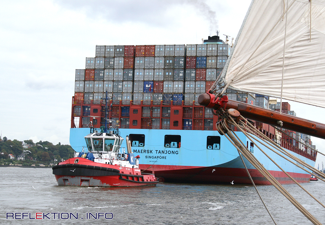 MAERSK TANJONG 333 Meter lang, 43,20 Meter breit, maximal 20,20 Meter Tiefgang, Fassungsvermögen 8230 20-Fuß-Container, 95.000 Tonnen BRZ - das sind die Eckdaten des Containerfrachters MAERSK TONJANG, der hier mit Assistenz der KOTUG-Schlepper ZOE und CONDON (gerade noch sichtbar am Bug) an seinen Liegeplatz am EUROKAI-Containerterminal im Hambuger Hafen bugsiert wird. Siehe dazu auch das Bild des Tages vom 15.3.2010