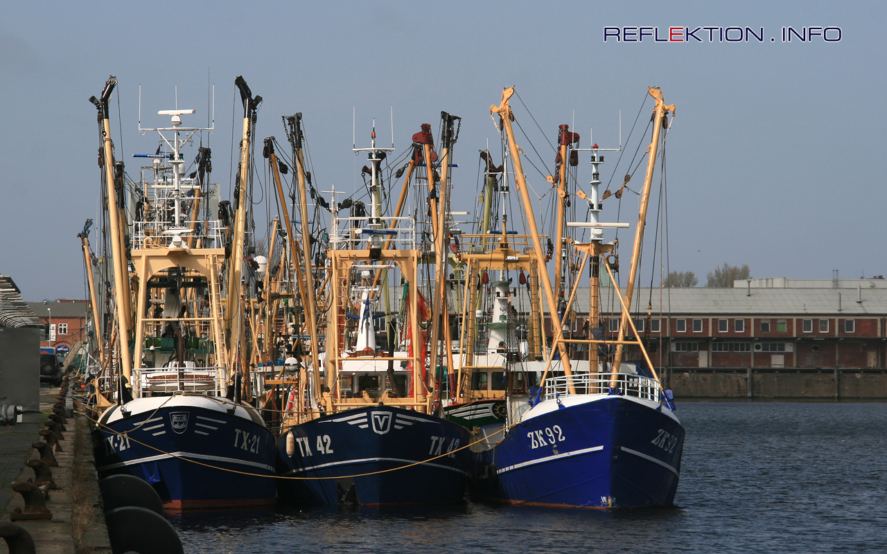 Niederländische Fischerboote Eng aneinander vertäut liegen in einer Ecke des Cuxhavener Fischereihafens 9 niederländische Fischkutter und halten Wochenendruhe. Fast wirkt es, als suchten sie Schutz vor der deutschen, heimischen Konkurrenz. Aber das wird wohl eine Einbildung sein.