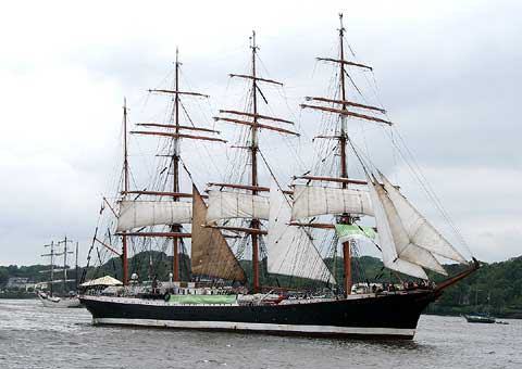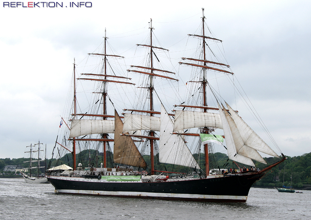 Die russische Viermastbark SEDOV fährt auf der Elbe bei Hamburg-Teufelsbrück in den Hamburger Hafen ein. Für die Bremer Reederei F. A. Vinnen wurde 1921 auf der Kieler Germaniawerft die stählerne Bark vom Stapel gelassen und als MAGDALENE VINNEN II getauft. 15 Jahre lang fuhr das Schiff Weizen aus Australien und Salpeter aus Chile nach Deutschland. Bei jeder Chilefahrt wurde auch Kap Hoorn umrundet. 1936 wurde die MAGDALENE VINNEN II an den Norddeutschen Lloyd verkauft und umgetauft in KOMMODORE JOHNSON. Nach dem 2. Weltkrieg wurde das Schiff als Reparationsleistung an die Sovjetunion übergeben. Vom Heimathafen Murmansk aus fährt die SEDOV seitdem als Schulschiff für die Ausbildung der Mannschaften der russischen Fischereiflotte. Die SEDOV diente auch als Drehort für den Film “Der Untergang der Pamir”. Die der PAMIR bauähnliche, vorher schneeweiße SEDOV erhielt dafür den schwarz-weißen Anstrich, den sie (leider) noch heute trägt.