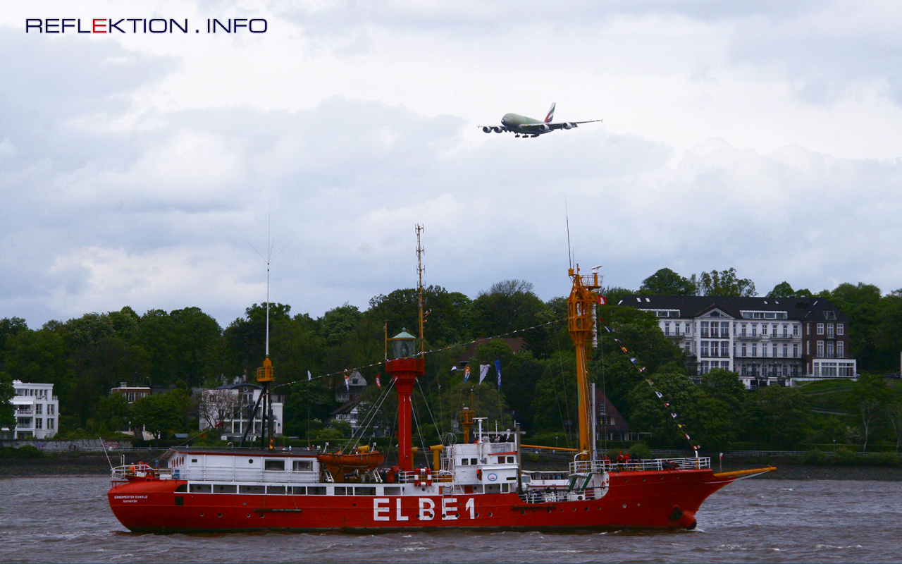 Feuerschiff ELBE 1 BÜRGERMEISTER O’SWALD II Auf der Position ELBE 1, dies ist der am weitesten in die Nordsee gesetzte Punkt (54° 0′ 0″ N, 8° 10′ 40″ O) eines Leuchtfeuers vor der Elbmündung, ist seit 1816 ist ein Feuerschiff stationiert. Die BÜRGERMEISTER O’SWALD II ist auf dieser Position von 1936 bis 1988 als letztes bemanntes Feuerschiff eingesetzt gewesen. Das rund 57 Meter lange und 9,50 Meter breite Schiff ist 1935 auf der Meyer-Werft in Papenburg gebaut worden und ist das größte Feuerschiff aller Zeiten. In den 52 Jahren seiner Dienstzeit ist es über 40 Mal mehr oder weniger schwer gerammt worden und ist damit das meist gerammte Schiff weltweit. Nach seiner Ausmusterung wurde die Stadt Cuxhaven neuer Eigentümer, die Stadt übergab das Schiff in den Besitz des Feuerschiff-Verein ELBE 1 von 2001 eV., der die BÜRGERMEISTER O’SWALD II seetüchtig hält. Bei Hafenfesten an der Nordseeküste ist die BÜRGERMEISTER O’SWALD II häufig anzutreffen, so auch hier zum 823. Hafengeburtstag Hamburg 2012. Zur über dem Feuerschiff zur Landung in Finkenwerder einschwebenden A380 ist hier mehr zu sehen
