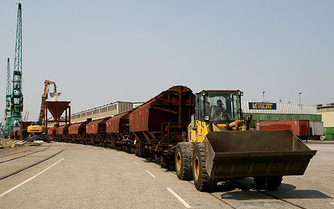 Am Kai des KAISER-WILHELM-HAFEN in Hamburg wird Kalk mittels eines Baggers in Schüttgutwagen der DB umgeladen. Aus 64 Achsen, bzw. 13 vierachsigen Wagen besteht der Zug, der nun, je weiter die Beladung vorangeht, immer einige Meter vorgezogen wird.