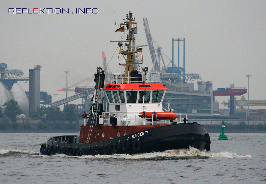 Schlepper BUGSIER 17 im Hamburger Hafen auf Höhe Köhlbrand elbabwärts fahrend der BUGSIER-, Reederei- und Bergungs GmbH & Co., Hamburg und Bremerhaven. Einige Daten: Heimathafen Hamburg Länge 28,00 m, Breite 9,00 m, Tiefgang 3,00 m BRZ 195 Geschwindigkeit 11 kn, Leistung 3100 PS, Pfahlzug 31,0t Baujahr 1992