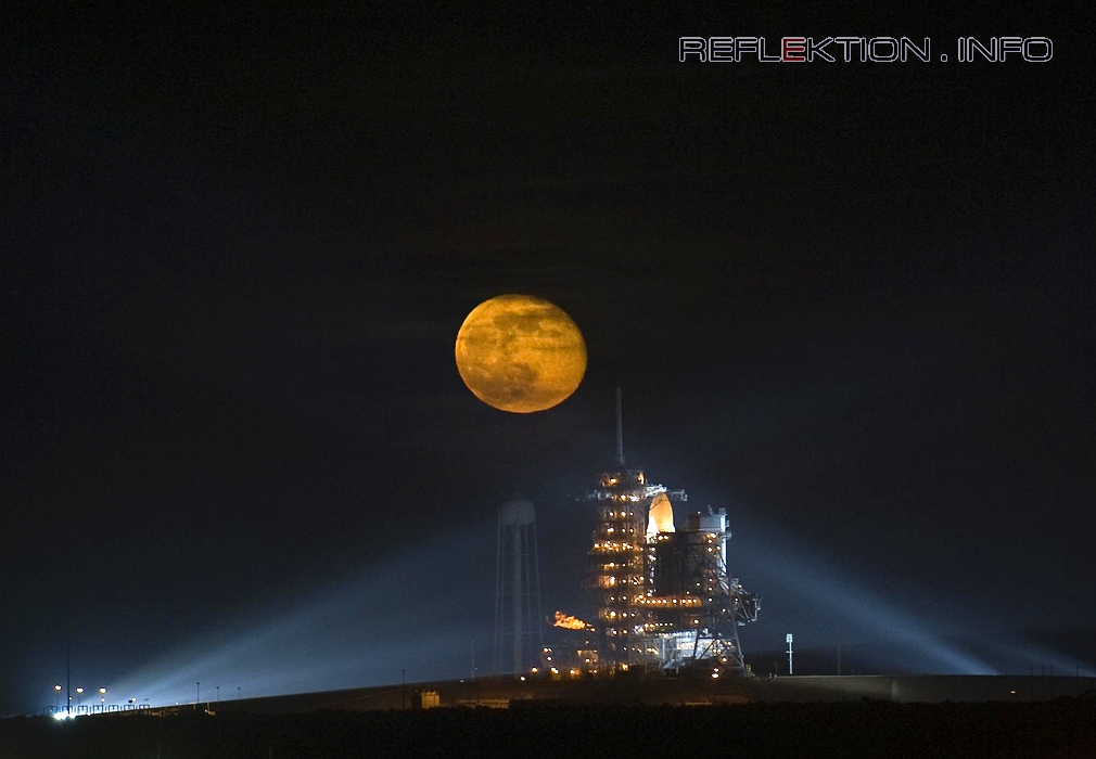 SPACESHUTTLE ENDEAVOUR - Mission STS-126 Wenige Minuten vor dem Start der ENDEAVOUR zur Internationalen Raumstation ISS steht der Vollmond über dem KENNNEDY SPACE CENTER. Mit dem Start der ENDEAVOUR am 15.11.2008 um 1.55 Uhr MEZ begann die Mission STS-126, die viel Mobiliar zur ISS bringt. So zwei Schlafstätten, eine Küchenzeile, ein neues Wasseraufbereitungssystem, einen Kühlschrank und Fitnessgeräte. Damit werden in Zukunft fünf Schlafkammern, zwei Bäder und zwei Küchen auf der ISS vorhanden sein. Nach der Installation können dann 6 statt bisher nur 3 Astronauten ständig auf der ISS leben. Die Mission wird 2 Wochen dauern.