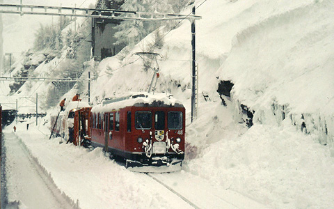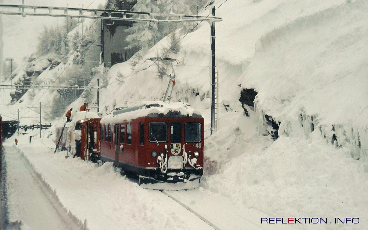 BERNINA BAHN - Schneeräumung, Teil 1 In Alp Grüm auf 2091 Meter ü.M. wird die Schneeräumeinheit, die von Pontresina herauf gefahren ist, in mühevoller und nicht ungefährlicher Handarbeit von Schnee und Eis befreit und für die nächste Räumfahrt vorbereitet. Die Schneemengen am Bernina sind nur in einer dreistufigen Arbeitsweise zu bewältigen: Erforderlich dazu sind 4 Fahrzeuge in 2 Einheiten. Die erste Einheit wird gebildet aus einer Schneeschleuder und einem Schleppfahrzeug, der Zweikraftlok (Diesel- und Elektroantrieb) Gem 4/4 801 mit Schneeschleuder Xrote 9219. Die andere Einheit besteht aus dem Räumer und einem weiteren Schleppfahrzeug, dem Triebwagen ABe 4/4 48 und dem Räumer 9132.