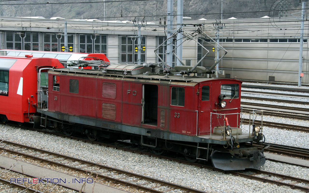 FURKA-OBERALP BAHN HGe 4/4 33 Über Jahrzehnte waren die in den Vierziger Jahren gebauten Zahnradloks HGe 4/4 31-36 und die Nachzüglerin 37 das Rückgrat der Zugförderung bei der FURKA-OBERALP Bahn. Noch Ende der Achtziger Jahre waren sie die Stammloks des GLACIER EXPRESS. Heute sind nur noch 2 dieser FO-Loks erhalten. Die 33 leistet im Depot Glisergrund der MATTERHON-GOTTHARD BAHN -2003 aus der Fusion von FO und BVZ entstanden- Verschubdienste. Es ist eine Schande, in welch heruntergekommenden Zustand sich die Lok heute präsentiert. Total verdreckt, verölt und verrostet - ein fahrendes Schrottensemble mit ungewisser Zukunft. Einer Schweizer Eisenbahngesellschaft absolut unwürdig.