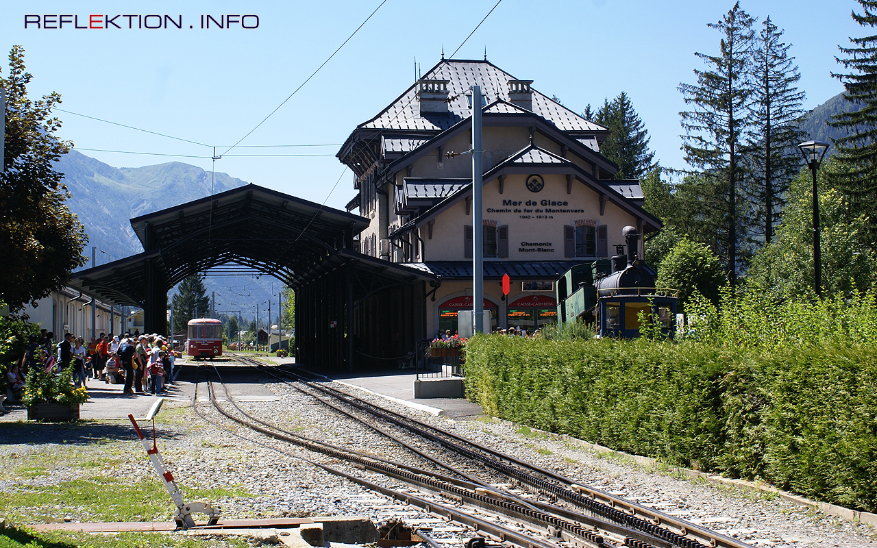 CHEMIN DE FER DU MONTENVERS Seit 1909 führt die 5 Kilometer lange Zahnradbahn von Chamonix in 25 Minuten auf den 1915 Meter hohen Montenvers zum Mer de Glace. Die Bahn bewältigt dabei 871 Höhenmeter mittels einer Zahnstange nach dem System Strub. 6 Triebwagen und 3 Dieselloks werden im Ganzjahresbetrieb eingesetzt, der nur für 2 Wochen Revisionsarbeiten jeweils zu Beginn der neuen Wintersaison unterbrochen wird.