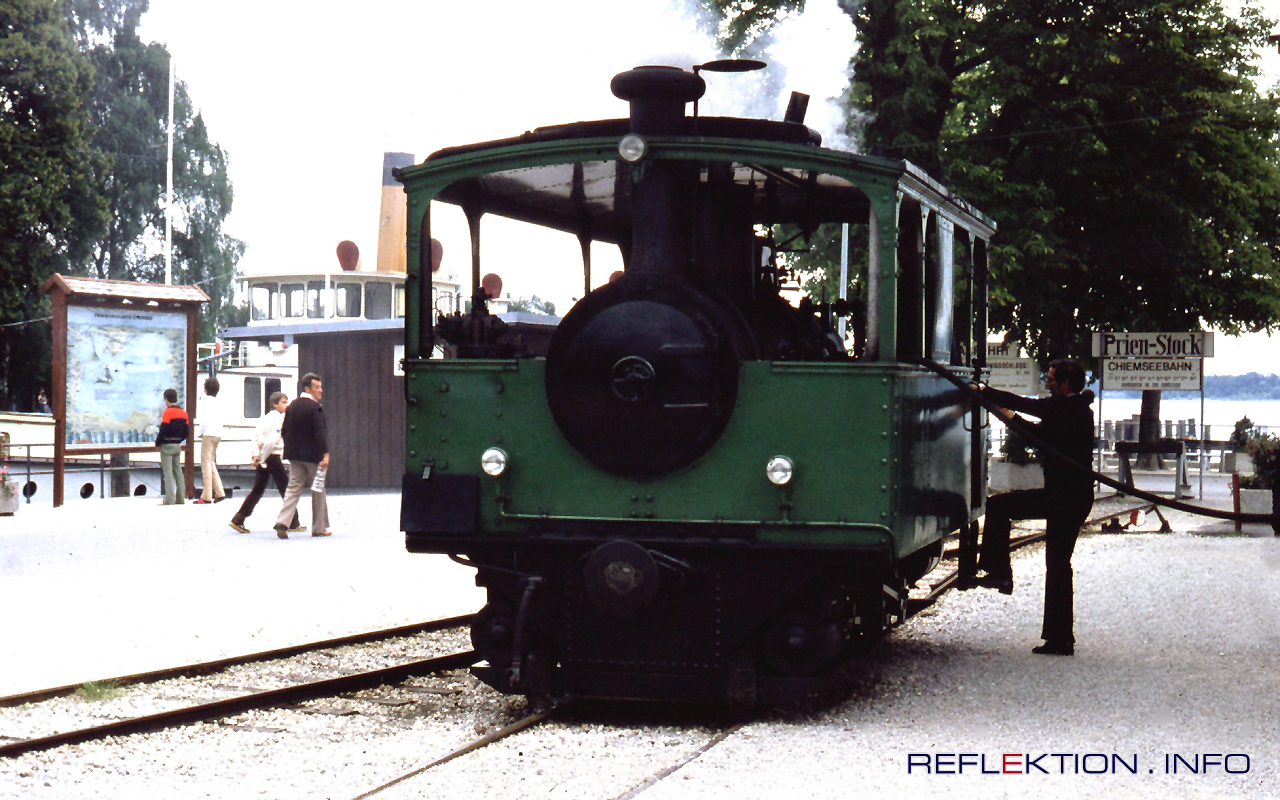 CHIEMSEEBAHN Es ist Frühlingsanfang und noch ist die Chiemsee-Bahn in der Winterpause. Aber am 1. Mai 2013 wird sie ihren ersten Arbeitstag in der neuen Saison haben und dann wie seit 1887 an Samstagen, Sonntagen und Feiertagen die Verbindung zwischen der Anlegestelle in Stock/Hafen und dem Bahnhof Prien herstellen. Lok und Wagen wurde 1887 von Krauss & Comp. als Tramwaybahn gebaut. Nach wenigen Monaten Planungs- und Bauzeit nahm die Chiemsee-Bahn am Sonntag, dem 10.Juli 1887 offiziell den Betrieb auf und verbindet bis heute den Bahnhof im Zentrum von Prien mit dem Hafen der Chiemsee-Schifffahrt in Stock Die Laufleistung der Lok beträgt ca. 5.000 km pro Jahr; dabei werden rund 25 Tonnen Kohle verheizt. Abfahrt von der Anlegestelle der Chiemsee-Schiffahrt in Stock in das 1,8 km entfernte Zentrum von Prien bis zum DB-Bahnhof Prien. Seit 1887 war an der Lok keine außerordentliche Reparatur erforderlich. Im Winter 1957/58 wurde ein neuer Kessel eingebaut.