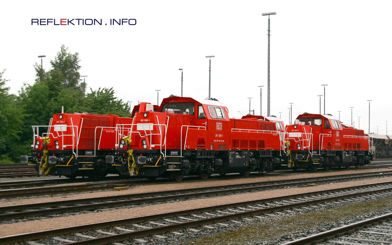 DB SCHENKER RAIL BR 261 Dieselrangierlokomotive GRAVITA 10BB Am 18. Februar 2011 stellte DB SCHENKER RAIL im Rangierbahnhof Maschen die erste von 15 im Bereich Hamburg stationierten Rangierlokomotiven der Baureihe 261, Typ Gravita 10 BB, in Dienst. Insgesamt kauft das Unternehmen in den nächsten Jahren 130 Lokomotiven für den bundesweiten Einsatz von der Voith Turbo Lokomotivtechnik GmbH und Co. KG in Kiel. Alle Fahrzeuge werden mit Rußpartikelfiltern ausgestattet. DB Schenker Rail setzt damit als erstes deutsches Unternehmen Diesellokomotiven in großer Zahl mit Partikelfiltern ein, mit denen die erst ab 2012 geltenden Grenzwerte eingehalten werden können. Nach Angaben des Herstellers können damit 97 Prozent der im Abgasstrom enthaltenen Rußpartikel herausgefiltert und so die Emissionswerte erheblich reduziert werden. Ein halbes Jahr später ist die GRAVITA im Hafenbahnhof Hamburg-Süd jederzeit präsent. Nahe des Ablaufbergs warten vier nagelneue GRAVITA, 261 027-7, 261 028-5, 261 030-1, 2621 040-0, auf neue Aufgaben.