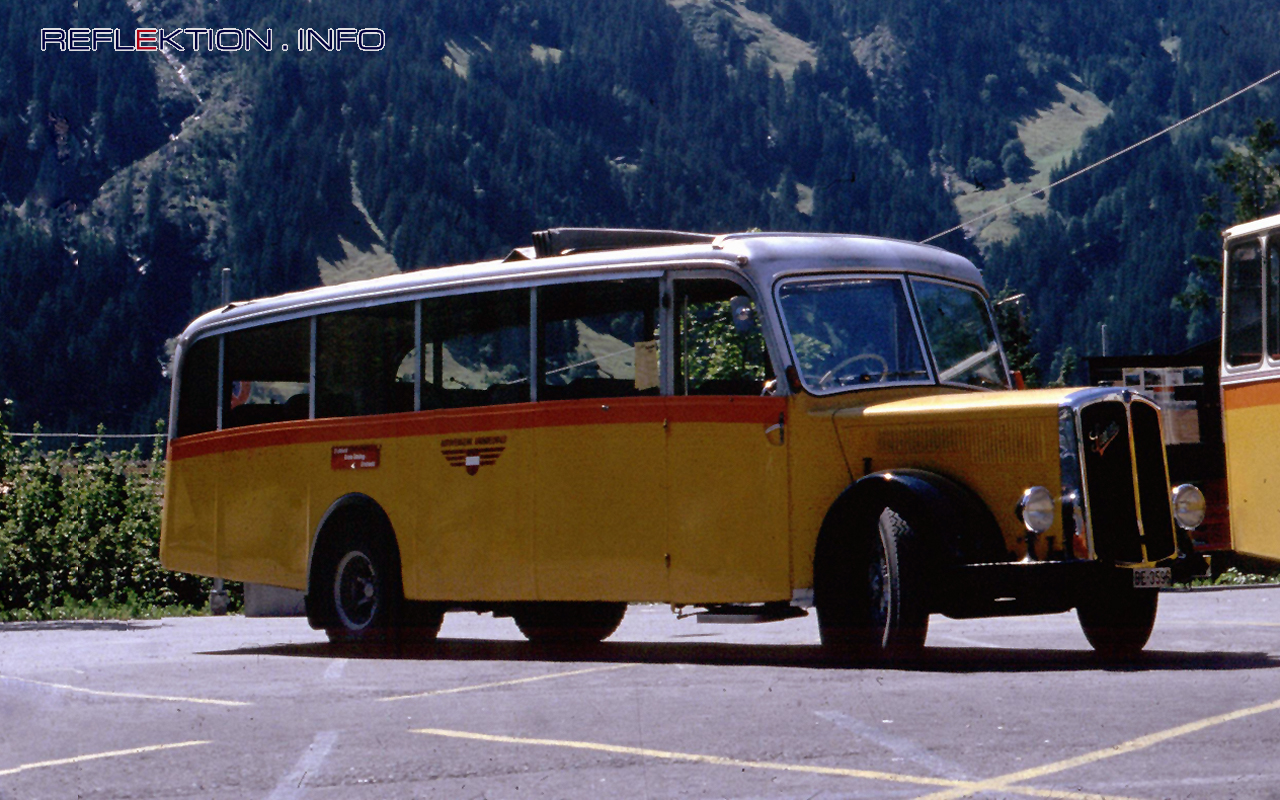 SAURER ALPENWAGEN, Bj. 1947 Der SAURER ALPENWAGEN aus dem Jahr 1947 war noch 1981 im täglichen Linienverkehr in Grindelwald im Berner Oberland im Einsatz. Nach jeder Fahrt zog der Fahrer ein Tuch aus der Hosentasche und polierte die Chromteile auf Hochglanz. Bei schönem Wetter wurde das über die gesamte Dachlänge reichende Faltdach aufklappt.