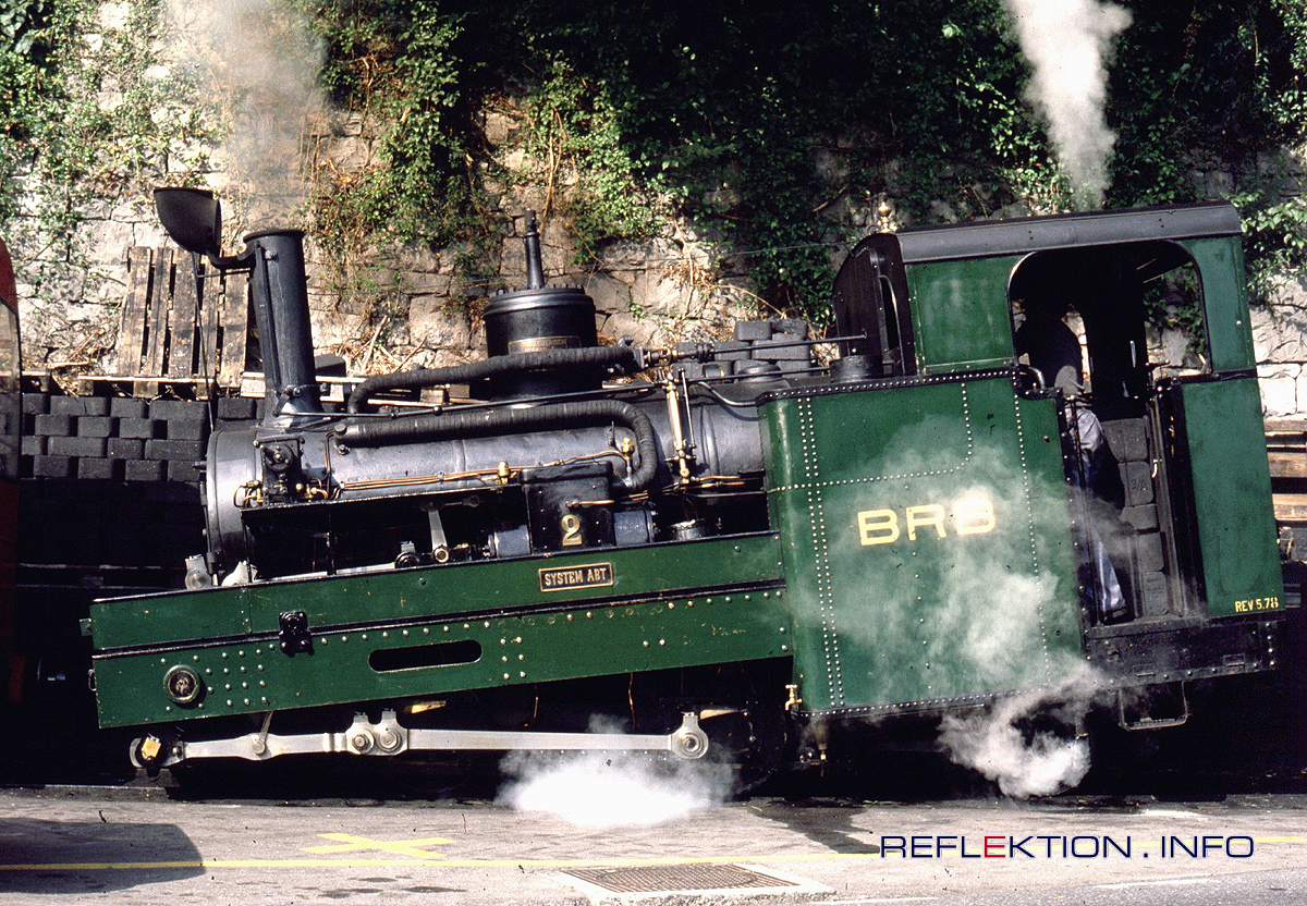 BRIENZ ROTHORN BAHN Dampflok Nr. 2 Die BRIENZ ROTHORN BAHN, die älteste Dampfzahnradbahn der Schweiz, fährt seit 1892 von Brienz auf das Brienzer Rothorn nahe Interlaken im Berner Oberland. In rund 1 Stunde Fahrtzeit überwindet die Bahn dabei 1678 Höhenmeter auf einer Streckenlänge von rund 7,5 km. Die Spurweite des Schmalspurgleises beträgt 800 mm. Durchgehend in allen Gleisen ist die doppellamellige Zahnstange nach dem System Abt verlegt. Die steilesten Streckenabschnitte sind 25 % geneigt. In einer Höhe von 2244 Meter wird die Endstation Rothorn Kulm erreicht. Der Betrieb wird mit 9 Dampflokomotiven, die ältesten stammen aus dem Jahr 1891 - die neuesten aus dem Jahr 1996, geführt. 2 weitere Dampfloks aus dem Jahr 1891 sind betriebsfähig remisiert. Zusätzlich sind 3 Dieselloks vorhanden. Technische Angaben zur Lok Nr. 2 Dienstgewicht 17 Tonnen, Leergewicht 14 Tonnen Triebzahnraddurchmesser 573 mm, Laufraddurchmesser 520 mm Leistung 230 PS, Kesseldruck 14 bar, Heizfläche der Feuerbüchse 3.5 qm, Heizfläche gesamt 43.5 qm Wasservorrat 2.200 Liter, Kohlevorrat 850 kg Kaufpreis bei der Schweizerischen Lokomotiv- und Maschinenfabrik Winterthur im Jahr 1891 42.000 Schweizer Franken