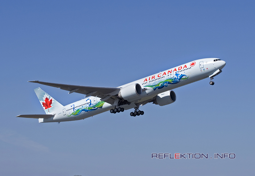 AIR CANADA BOEING B777-300ER C-FIVS Am 8. Juli präsentierte AIR CANADA ihre Boeing 777-300ER C-FIVS, die mit 6 Motiven olympischer Wintersportarten lackiert ist. Auf der Steuerbordseite werden der Snowboard-Parallel-Riesenslalom, Eishockey und Skilanglauf gezeigt. Weitere 3 Motive auf der Backborseite sind alpiner Skisport, Eishockey und Skispringen. AIR CANADA wirbt so für die 21. Olympischen Winterspiele in Vancouver und Whistler vom 12. bis zum 28. Februar 2010. Während der Winterspiele wird AIR CANADA neue Nonstop-Verbindungen von Vancouver nach Frankfurt, Paris, Genf und Zürich einrichten.