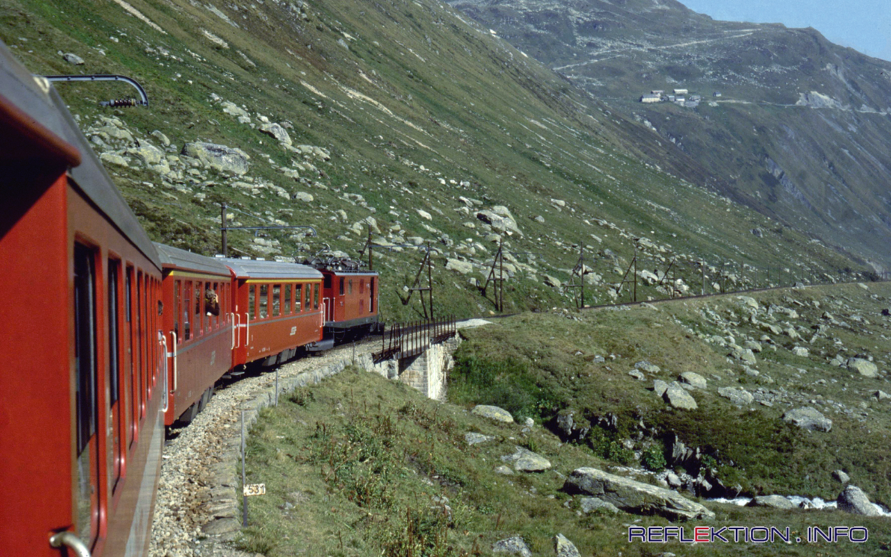 Vor 30 Jahren war die FURKA-OBERALP BAHN (FO) noch eine eigenständige Bahngesellschaft und nicht Teil der heutigen MATTERHORN-GOTTHARD BAHN (MGB). Auch war der Furka-Basitunnel noch nicht im Betrieb, so daß die Züge über die heute wieder von der Dampfbahn Furka-Bergstrecke (DFB) genutzte Furka-Bergstrecke fuhren.