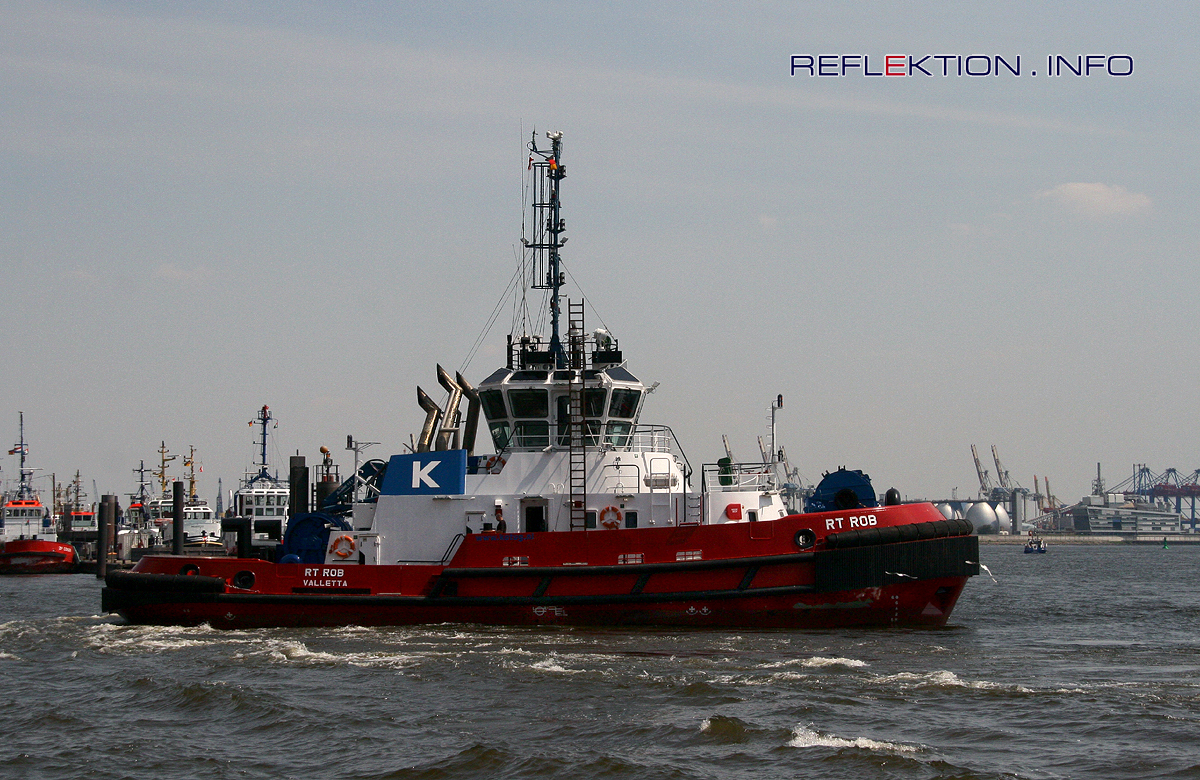 Assistenz-Schlepper KOTUG RT ROB Die niederländische Reederei KOTUG ist mit ihren Schleppern in den deutschen Häfen Bremerhaven und Hamburg aktiv. Die erst 1 Jahr alte RT ROB ist vor kurzem von Bremerhaven nach Hamburg versetzt worden. Von den insgesamt 4 KOTUG-Schleppern in Hamburg erzielt RT ROB mit einer Gesamtleistung von 5295 KW, entsprechend 7200 PS die stärkste Leistung. Das 30 Meter lange und 12 Meter breite Schiff hat einen Pfahlzug von 85 Tonnen. Für die neueste Generation der Containerfrachter mit einem Fassungsvermögen von rund 14.000 20-Fuß-Containern ist die Leistung von RT ROB gerade recht.