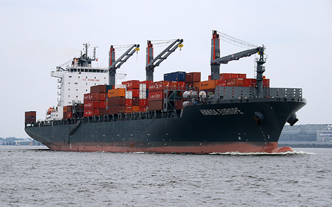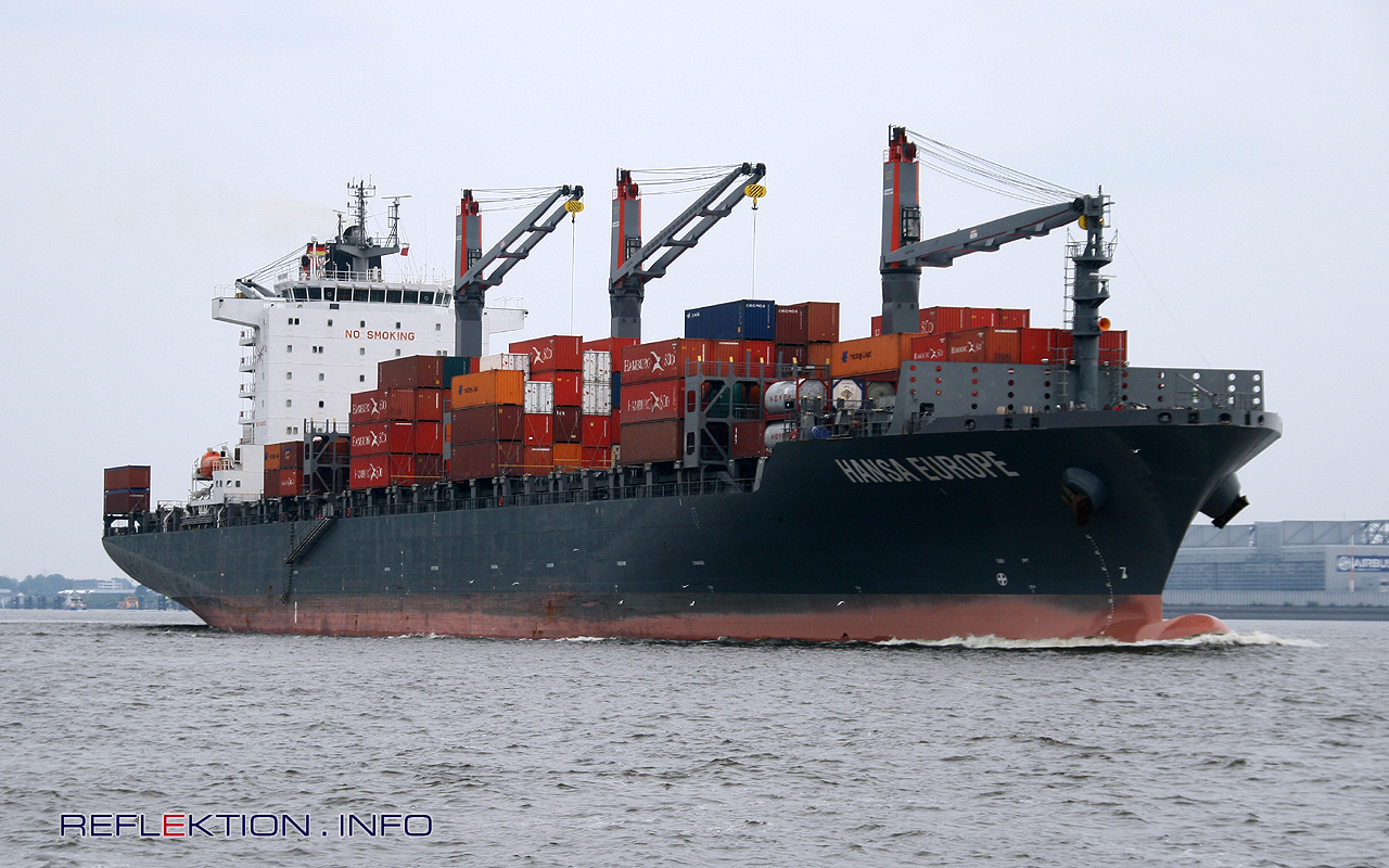 HANSA EUROPE Der Containerfrachter ist mit 4 Kränen ausgerüstet, um in kleineren Häfen ohne Containerbrücken Container selbst löschen zu können. Das Schiff ist auf einem 56 Tage dauernden Europa-Amerika-Umlauf über Rotterdam, Hamburg, Antwerpen, Le Havre, Kingston (Jamaica), Cartagena (Kolumnien), Manzanillo (Panama), Guayaquil (Ecuador), Callao (Peru), Paita (Peru) eingesetzt. Einige Daten: Baujahr 2012 bei Shanghai Chengxi Shipyard, China Flagge Liberia, Monrovia BRZ 38388; Tragfähigkeit 47267 t Container 3649 20-Fuß-Container, Hebekapazität 40 t Länge 240,00 m; Breite 32,00 m; Tiefgang 10,50 m Leistung 31710 kW; Geschwindigkeit: 22 Knoten Reederei Hapag Lloyd; Owner Leonhardt & Blumberg, Hamburg