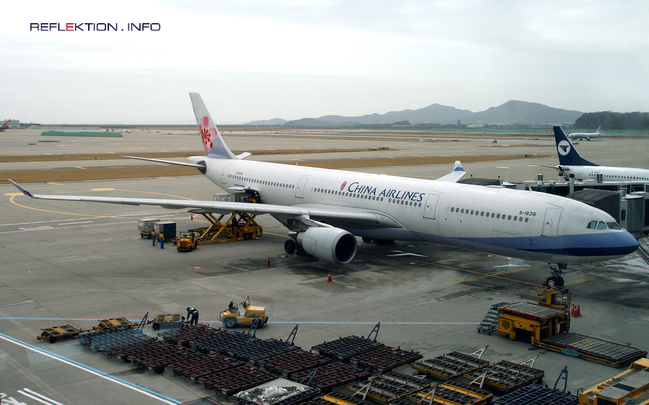 CHINA AIRLINES AIRBUS A330-300 B-18316 Die taiwanesische Fluggesellschaft CHINA AIRLINES wurde 1959 gegründet und betreibt derzeit eine Flotte von 68 Maschinen: 20 AIRBUS A330, 6 AIRBUS A340, 10 BOEING 737 und 32 BOEING 747. Drehkreuz ist der Flughafen Taiwan-Taoyuan. Weitere Stützpunkte sind Hong Kong und Kaohsiung. Neben einigen Zielen in Taiwan werden in Asien u.a. Tokio, Singapur, Delhi und Jakarta angeflogen. Weltweite Ziele sind Amsterdam, Rom, Los Angeles, Honolulu, Sydney und Guam, Frankfurt und Wien. CHINA AIRLINES verzeichnet in den 54 Jahren ihres Bestehens eine überdurchschnittlich hohe Unfallquote. So ereigneten sich allein seit 1991 6 Totalverluste mit mehr als 800 Toten.