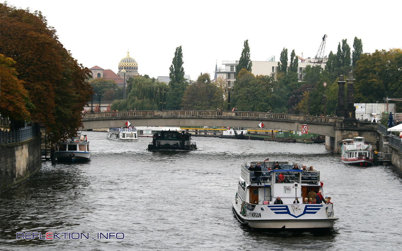 Touristikboote auf der Spree Jedem Berlin-Touristen sei eine Fahrt in einem Touristikboot auf der Spree empfohlen. Ein- und zweistündige Touren starten zum Beispiel an der Weidendammer Brücke über die Friedrichstraße. DerBlick geht hier nach Norden von der Spree-Brücke der Karl-Liebknecht-Straße in RichtungBodestraße, im Hintergrund die jüdische Synagoge in der Oranienburger Straße.