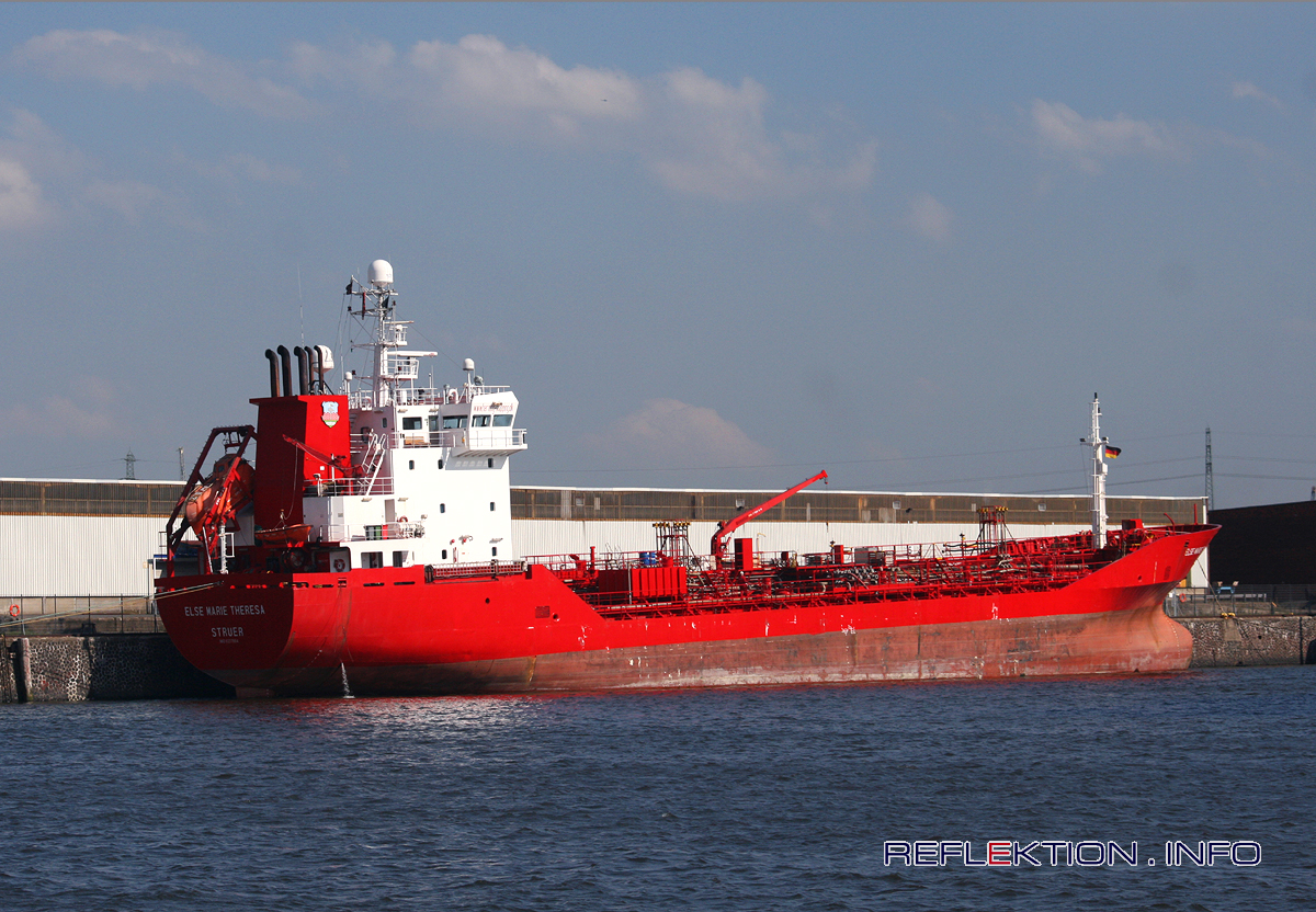 CHEMIETANKER ELSE MARIE THERESA Die dänische Tankskibsrederiet Herning A/S betreibt 2001 in Dienst gestellten Chemikalientanker ELSE MARIE THERESA. Das Schiff transportiert zwischen den europäischen Staaten und den Mittelmeerländern verschiedene Chemiekalien, wie z.B. Wachs oder Palmöl. Der Doppelhüllentanker besitzt 12 Ladetanks mit einem Gesamtfassungsvermögen von 4275 cbm. Weitere Daten: Länge 96 Meter, Breite 14 Meter, Tiefgang bis 6,10 Meter Geschwindigkeit maximal 13 Knoten, Heimathafen Struer, Dänemark Baujahr 2001