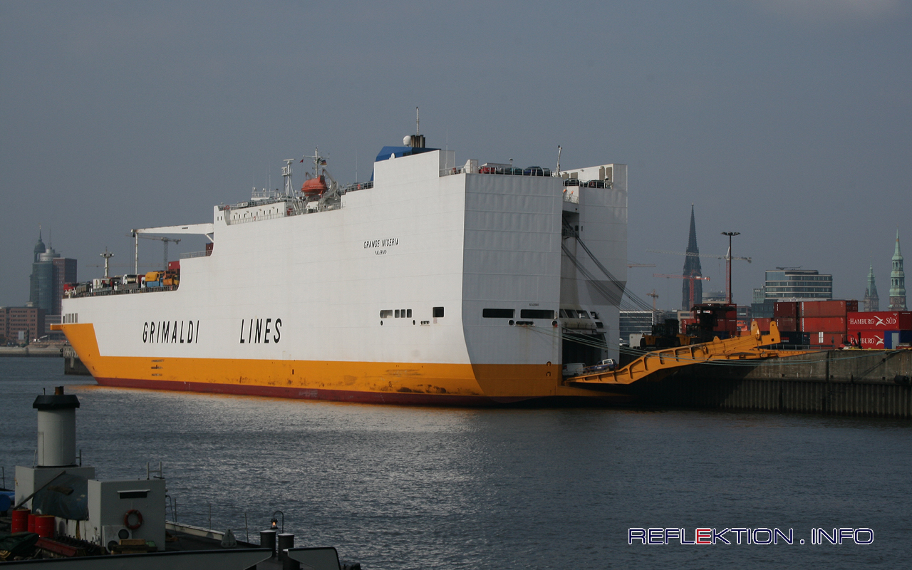 Die GRANDE NIGERIA befährt für die italienische Reederei GRIMALDI LINES im Linienverkehr die Route Hamburg - Afrika. Der ConRo-Frachter transportiert hauptsächlich Autos nach Abidjan in der Elfenbeinküste, Lagos, Monrovia, Cotounou und Tema Die Verladung der Fahrzeuge erfolgt meistens mit sogenannten Pushern, gummibewehrten Fahrzeugen, die die Exportautos Stoßstange an Stoßstange an Bord schieben. Solch Manöver ist am rechten Bildrand zu erkennen. Beliebt sind auch gedoppelte Fahrzeuge, LKW’s, die mit LKW’s beladen sind. Das Vorderdeck der GRANDE NIGERIA ist voll von Gedoppelten. Die GRANDE NIGERIA und ihre 8 Schwesterschiffe verfügen über bordeigene Krananlagen und sind somit unabhängig von Containerterminal und Kaikränen.