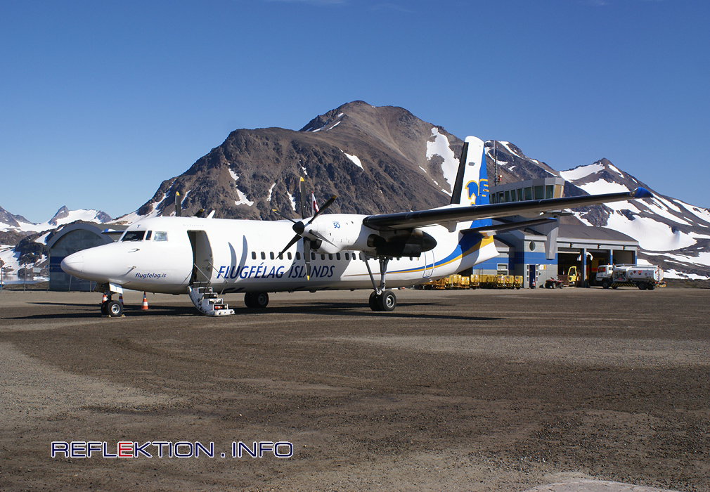 FLUGFÉLAG ISLANDS FOKKER 50 TF-JMT Die FOKKER 50 der FLUGFÉLAG ISLANDS ist im Auftrag der AIR ICELAND als Linienflug auf dem Flugplatz Kulusuk im Südosten von Grönland gelandet und wartet nun auf das Einsteigen der Passagiere für den knapp dreistündigen Rückflug nach Reykjavik auf Island. Die dortige Landung wird auf dem Stadtflughafen erfolgen. Die fünfzigsitzige F50 ist 1992 gebaut worden und seitdem auf Island beheimatet - zuerst bei der Vorgängergesellschaft FLUGLEIDIR. Die Maschine wurde bei Inbetriebnahme FREYDIS getauft - den Namen trug sie bis 2002.