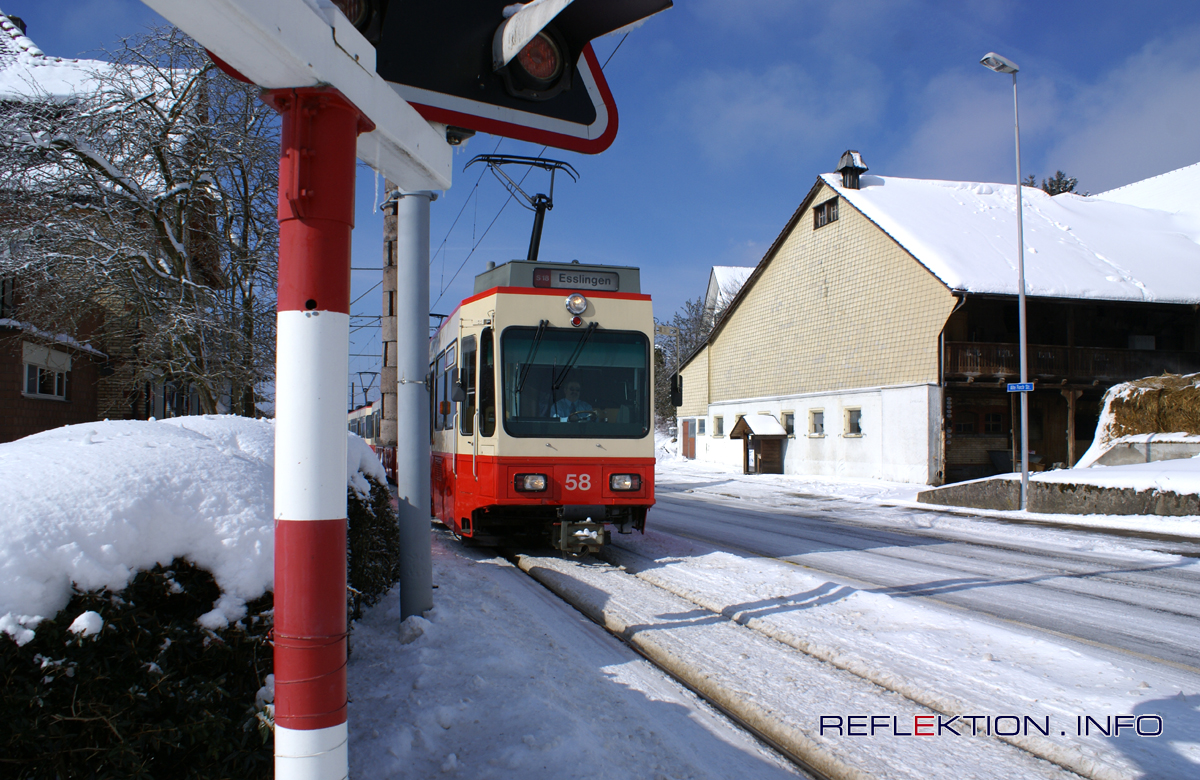FORCHBAHN Die 13 km lange schmalspurige FORCHBAHN verbindet Stadelhofen und Esslingen im Schweizer Kanton Zürich. Der Triebwagen Be 4/4 58 passiert auf halber Strecke beim Restaurant Neue Forch die mit 675 Meter über Meer höchste Stelle der FORCHBAHN.
