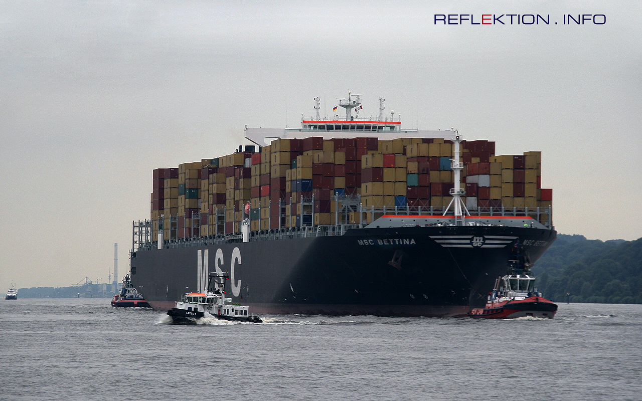MSC BETTINA Am 26. August 2010 lief die MSC BETTINA mit Assistenz zweier KOTUG-Schlepper erstmals in Hamburg ein und machte im Waltershofer Hafen fest. Das bei Samsung in Korea gebaute 365,50 Meter lange und 51,20 Meter breite Schiff ist mit 151559 BRZ vermessen. Die Ladekapazität beträgt 13.798 TEU. Vollbeladen erreicht der Tiefgang rund 16 Meter. Nach der MSC IRENE ist es der zweite MSC-Containerdampfer dieser Klasse, der den Hamburger Hafen anlief. Angetrieben von einem MAN-B&W Motor erreicht die MSC BETTINA eine Geschwindigkeit von 25,5 Knoten (47,3 km/h). Die italienische Reederei MSC fährt inzwischen mit 12 Schiffen dieser Klasse. Anders als bei der Mehrzahl der herkömmlichen Containerschiffe steht das Deckshaus sehr weit vorn und ist vom traditionell hinten eingebauten Antriebssystem getrennt und rund 130 Meter enfernt. Durch die bessere Sicht können mehr Container an Deck geladen werden, der größere Vorteil liegt jedoch in einer besseren Massenverteilung in der Schiffsstruktur. Mit dem Einsatz der MSC BETTINA erweitert die Mediterranean Shipping Company (MSC) den Liniendienst LION SERVICE und erhöht dessen Kapazität auf der Route Nordeuropa-Fernost/China. Die bisher zwischen den Fernost-Häfen und Hamburg eingesetzten Einheiten sind mit Stellplatzkapazitäten zwischen 9.200 und 9.600 TEU bereits große Schiffe. Eingesetzt werden jetzt insgesamt 11 Schiffe. Davon die beiden 14.000 TEU Containerriesen BETTINA und IRENE, drei 11.300 TEU Schiffe und fünf 9.200 TEU-Einheiten.