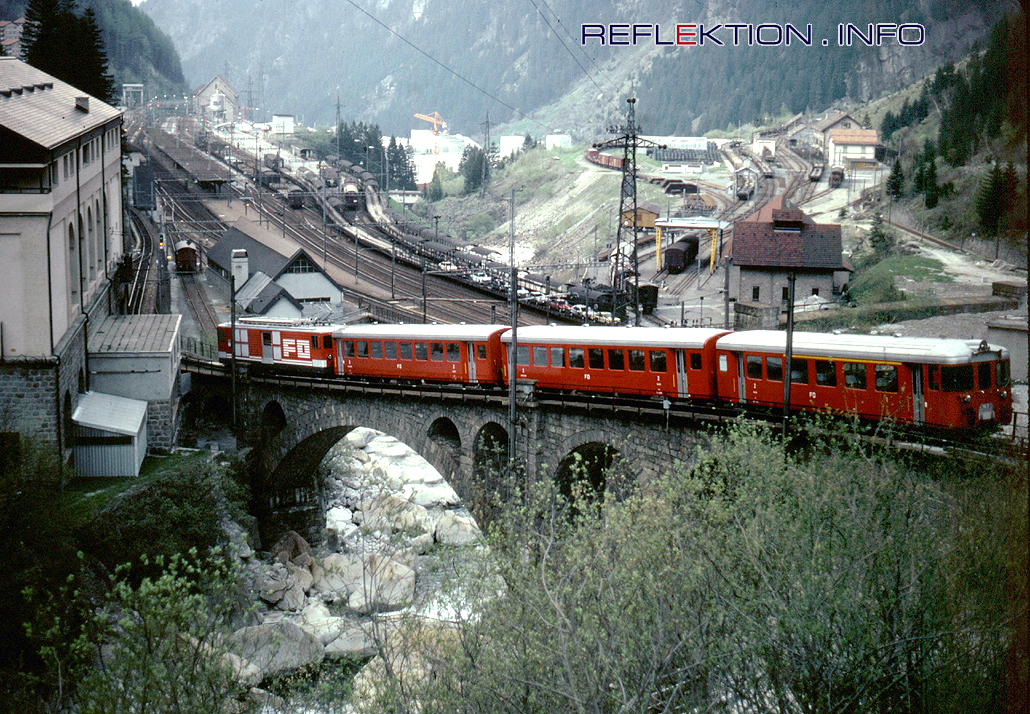 SCHÖLLENENBAHN Die Schöllenbahn verbindet Göschenen an der Nordeinfahrt des Gotthard-Tunnel auf 1100 Meter Höhe und Andermatt auf 1450 Metern Höhe. Die Schöllenbahn war bis 1961 eigenständig und fusionierte dann mit der Furka-Oberalp Bahn. Nach einer weiteren Fusion mit der Brig-Visp-Zermatt Bahn heißt das Unternehmen heute Matterhorn-Gotthard Bahn (MGB). Die nur rund 4 km lange, meterspurige Schöllenenbahn ist mit Zahnstangen des System Abt ausgerüstet. Die maximale Steigung beträgt 18 Prozent. Der Pendelzug im Bild überquert die Reussbrücke kurz vor der Einfahrt in den schmalspurigen Teil des Bahnhofs Göschenen. Triebfahrzeug ist der Gepäcktriebwagen Deh 4/4 92