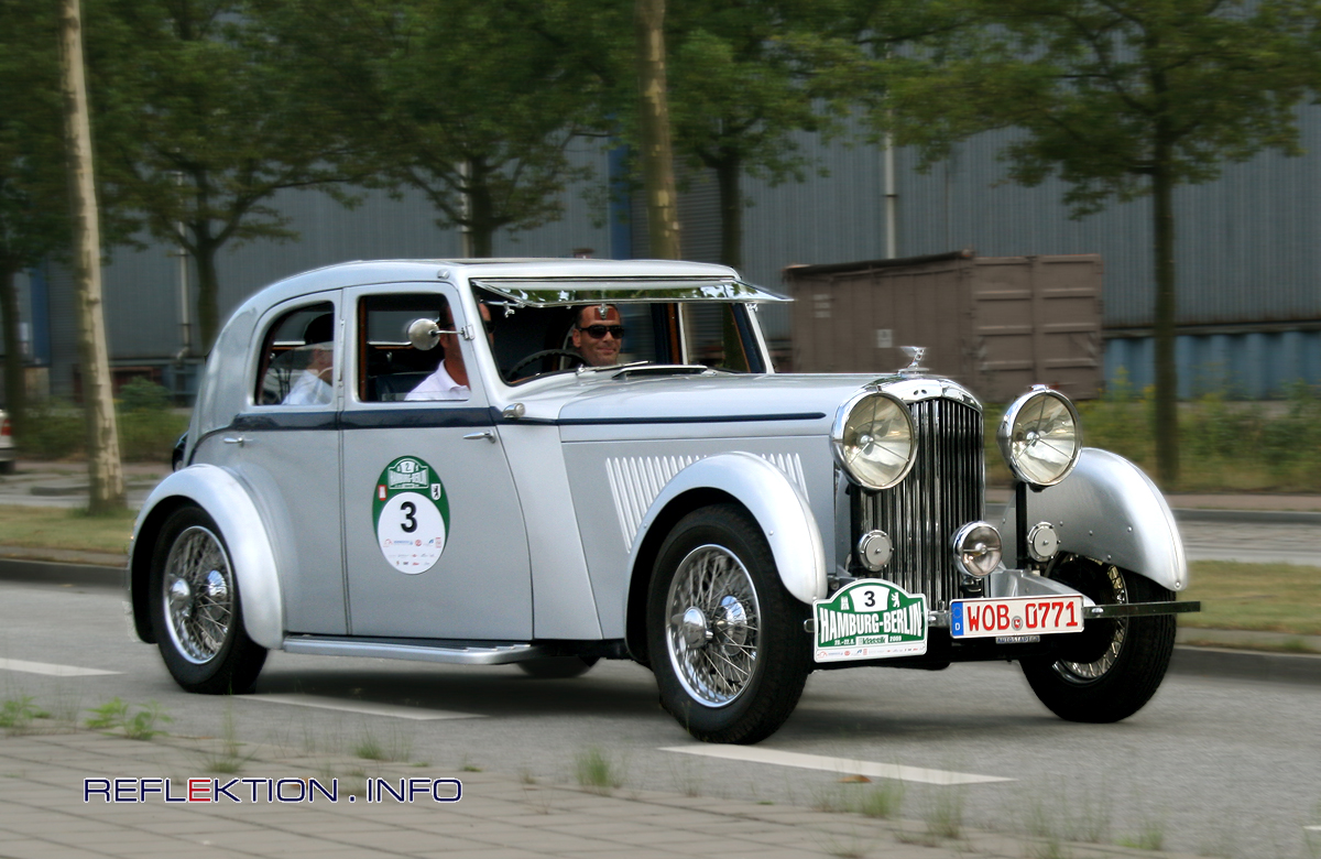 BENTLEY 3 1/2 LITRE PARK AWARD AERO SALOON Der bestens restaurierte BENTLEY von 1935 kam aus der Autostadt Wolfsburg zur 2. Klassikfahrt Hamburg-Berlin. Der 6-Zylinder-Motor mit 3669 ccm leistet rund 106 PS und beschleunigt das Fahrzeug bis auf 140 km/h.