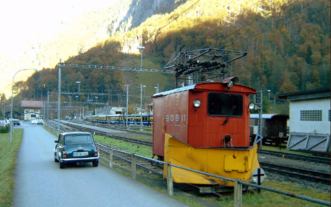 Der 1908 gebaute, kleine zweiachsige Schneepflug mit Eiskratzer steht im Herbst 2007 im Bahnhof Zweilütschinen der BERNER OBERLAND BAHNEN bereit für die Aufgaben der nahen Wintersaison. Beachtenswert ist die Montage des Pantographen auf einem Zwischengerüst, um die geringe Bauhöhe des Fahrzeugs ausgleichen zu können.