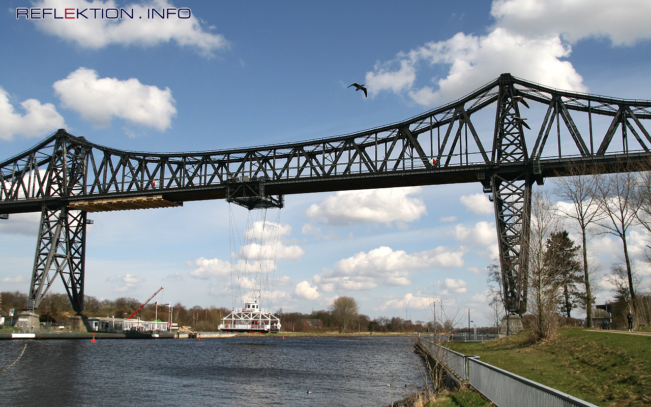 Die 1913 eingeweihte Rendsburger Hochbrücke führt die Eisenbahn von Hamburg nach Flensburg und Dänemark in einer lichten Höhe von 42 Metern über den Nord-Ostsee-Kanal. Zusätzlich ist eine elektrisch angetriebene Schwebefähre für den Fahrzeug- und Personenverkehr unter der Brücke an Stahlseilen angehängt. In jeder der 2 Minuten dauernden Überfahrt können maximal 4 PKW und 60 Personen an das andere Ufer gebracht werden. Die Nutzung der Fähre ist kostenlos. Generell verkehrt die Fähre viertelstündlich, allerdings hat der Schiffsverkehr Vorrang.