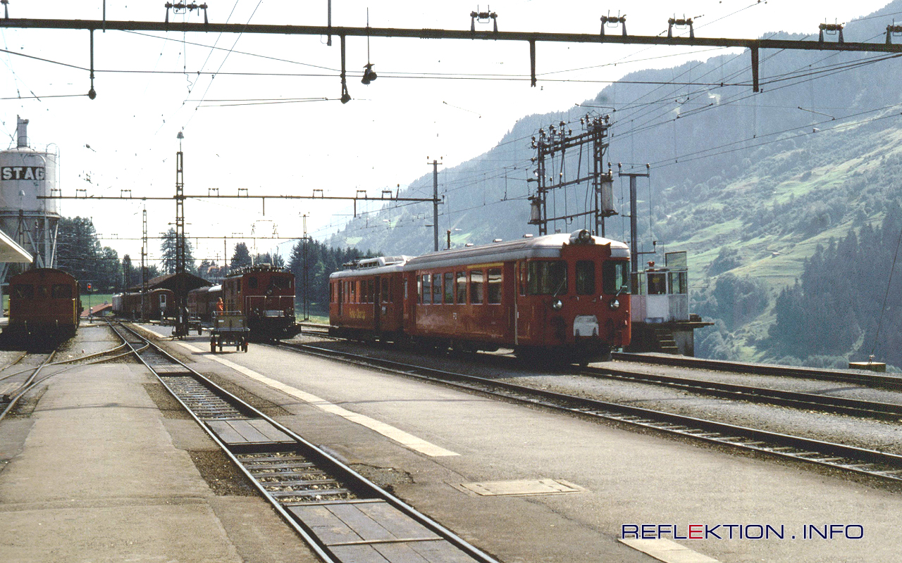 Die FURKA-OBERALP BAHN heißt heute nach ihrer Fusion MATTERHORN-GOTTHARD BAHN, der Pendelzug mit dem Triebwagen BDeh 2/4 ist ausgemustert, die Zahnradlok HGe 4/4 31 ebenfalls. Der auf dem linken Gleis wartende RhB-Traktor Tm 2/2 hat eine neue Heimat gefunden. Die weiter hinten stehenden RhB-Wagen sind heut alle rot lackiert.