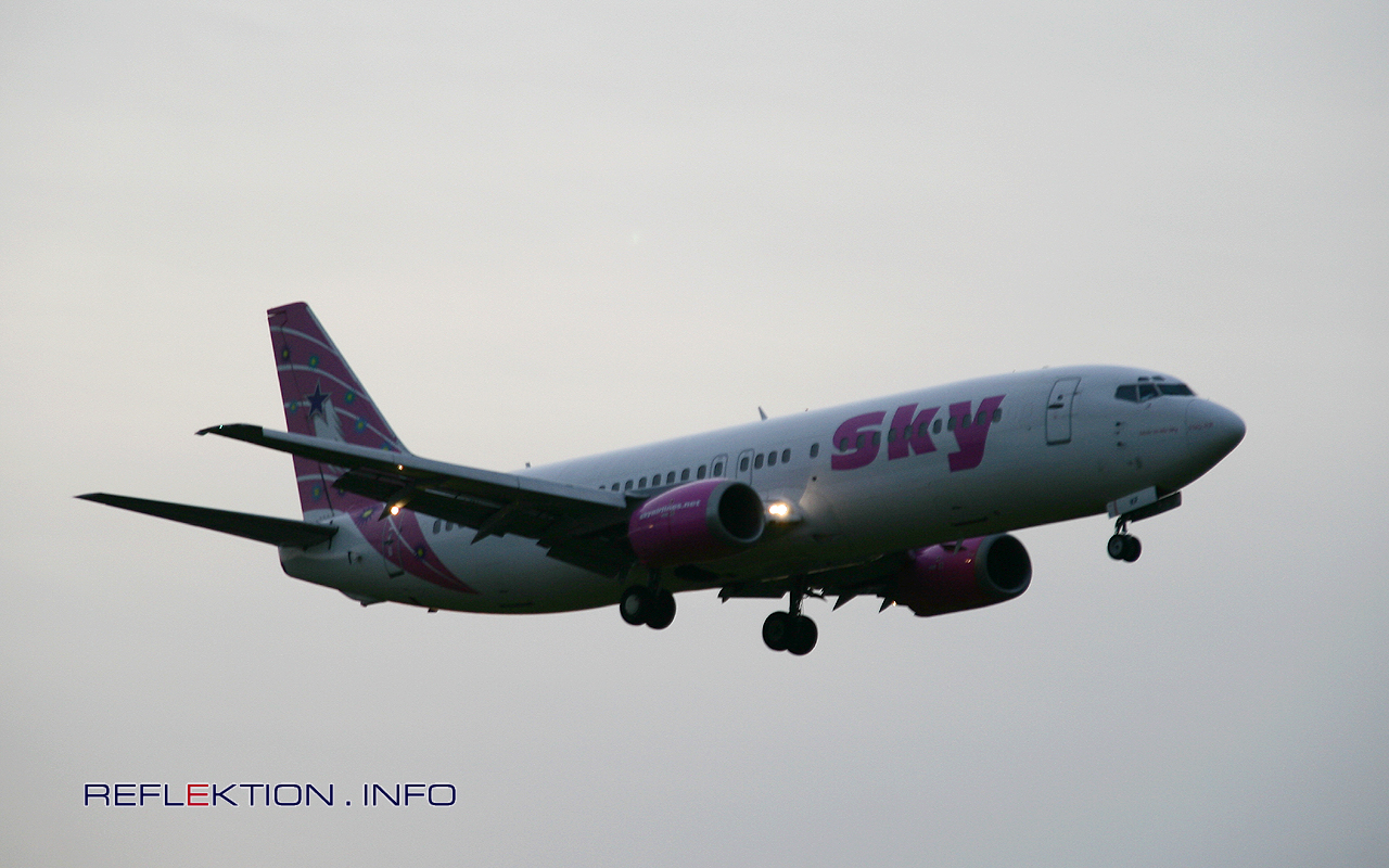 SKY AIRLINES BOEING 737-400 TC-SKF Die türkische FluggesellschaftSKY AIRLINES fliegt im Charterbetrieb für Reiseunternehmen mit 17 Flugzeugen der Typen AIRBUS A 320 und A 321, sowie BOEING 737-400, 737-800 und 737-900 mehr als 50 Ziele in Europa und im Nahen Osten an. Bemerkenswert ist, daß alle Flugzeuge im gleichen Design gehalten sind - aber jedes in einer anderen Farbstruktur lackiert ist.