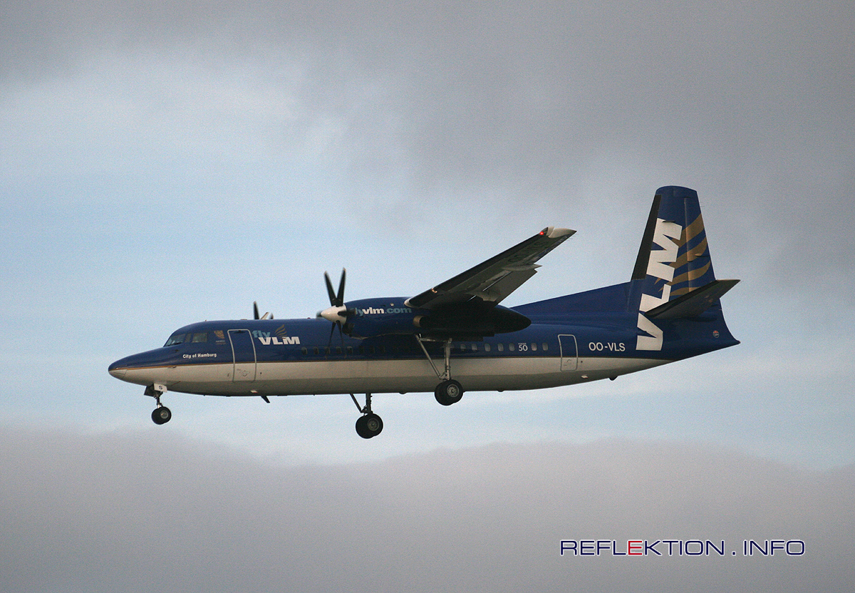 VLM OO-VLS FOKKER F50 Die belgische VLM (Vlaamse Luchttransportmaatschappij - Flemish Air Transport Company) betreibt 19 Maschinen des Typs FOKKER F50. Die F50 ist mit 50 komfortablen Ledersitzen bei großzügigem Sitzabstand ausgerüstet. VLM bedient innereuropäische Kurzstrecken mit den Zielen London City, Manchester, Isle of Man, Jersey, Guernsey, Amsterdam, Brüssel, Antwerpen, Groningen, Luxemburg, Rotterdam und Hamburg. Bereits ab 124 Euro inklusive aller Zusatzkosten fliegt man täglich von Hamburg nach Rotterdam und zurück.