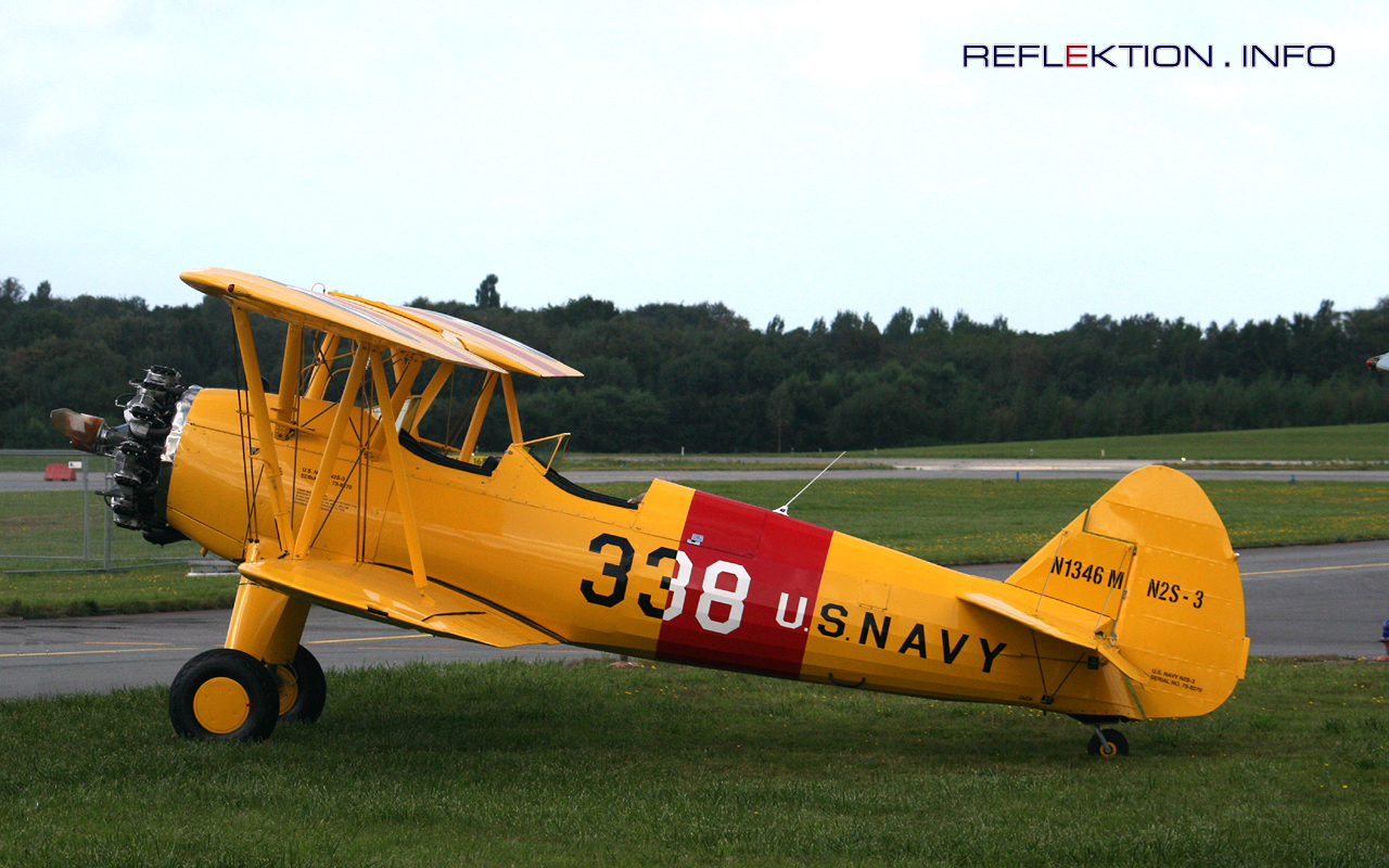 BOEING N2S-3 STEARMAN N1346M, Bj. 1943 Weit über 8.500 des STEARMAN genannten Model 75 baute BOEING in verschiedenen Versionen während rund 20 Jahren ab 1934. Der zweisitzige Doppeldecker war als Schulflugzeug sowohl zivil als auch bei der US AIR FORCE, der US NAVY und in vielen anderen Ländern eingesetzt. Die USAAF bezeichnete die Maschine als PT-13, PT-17 und PT-18. Bei der US NAVY hieß der Doppeldecker N2S. Noch heute sind weltweit rund 150 flugfähige Maschinen im Privatbesitz aktiv. Auf nahezu jedem Flugevent sind STEARMAN anzutreffen.