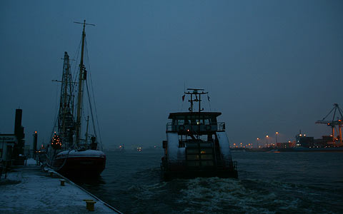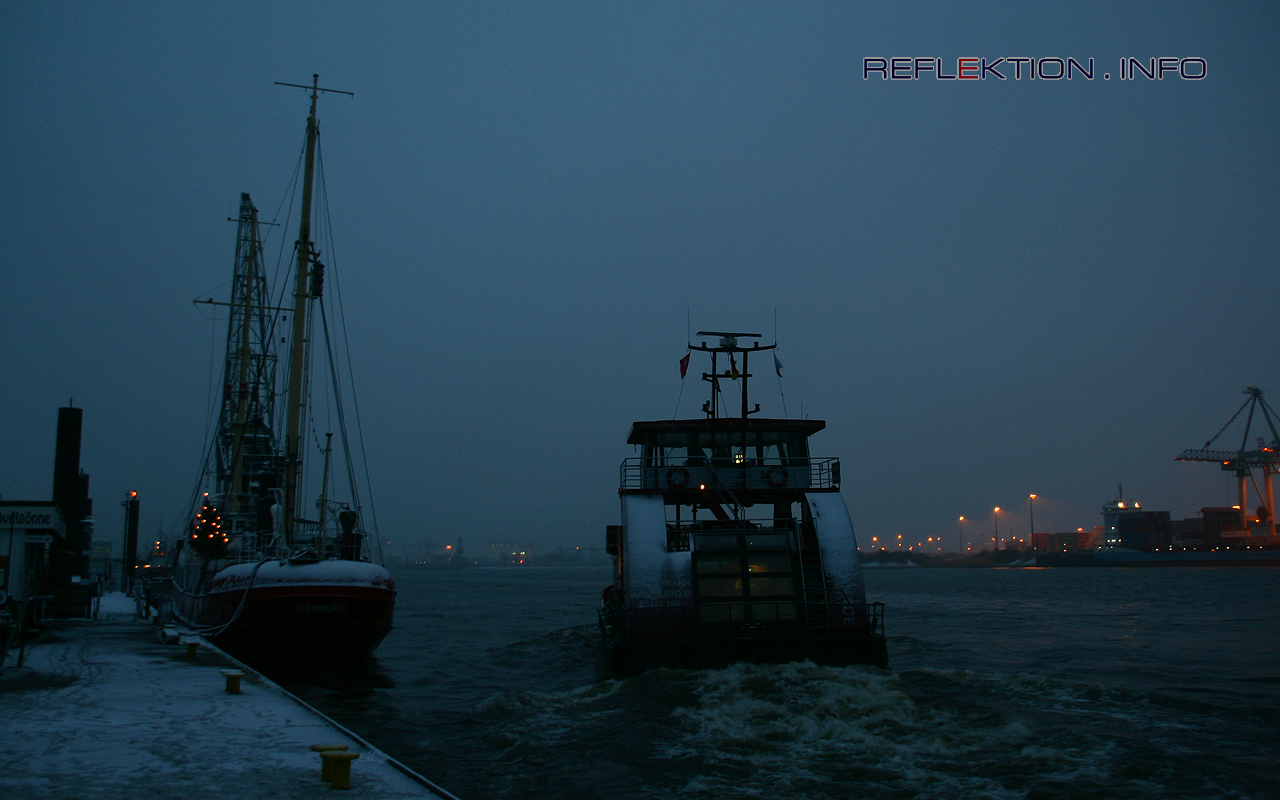 Links im Bild das zum Museumshafen gehörende und mit einem Weihnachtsbaum geschmückte Feuerschiff ELBE 3. Rechts, auf der anderen Elbseite ist vom Containerterminal Burchardkai gerade noch eine Containerbrücke zu sehen.
