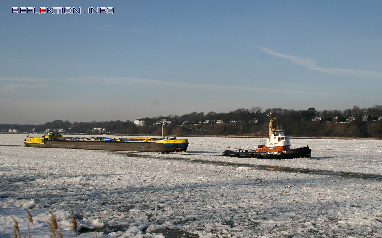 Eis auf der Elbe Die Oberelbe war bis kurz vor Hamburg wegen des starken Eisgangs für jeden Schiffsverkehr während der letzten 3 Wochen gesperrt worden. Ab Hamburg in Richtung Nordsee hielten sich die Einschränkungen auf der Unterelbe in Grenzen. Die Fähre Glückstadt-Wischhafen als einzige Elbquerung zwischen Hamburg und der Nordsee ist allerdings wegen des Eisgangs noch immer eingestellt. Binnenschiffen wie hier der BEVENRODE wurden Schlepper wie KARL MORITZ (Bj. 1964, L 22,09 m. B 7,02 m, Tiefgang 2,70 m, Pfahlzug 11 t, max 12,5 Knoten) vorgespannt.