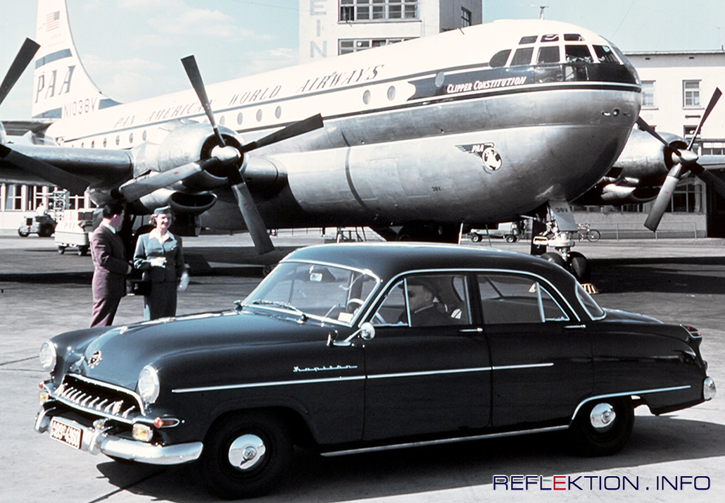 OPEL KAPITÄN & BOEING 377 STRATOCRUISER Der neue OPEL KAPITÄN auf dem Frankfurter Flughafen vor dem PAN AM CLIPPER CONSTITUTION BOEING 377 STRATOCRUISER. BOEING baute die 377 großteils aus Komponenten des Frachtflugzeugs C-97( Rumpf) und des Bombers B-29 (Tragflächen, Motoren, Seiten- und Höhenleitwerk) von 1947 bis 1950 als Langstrecken-Passagierflugzeug. Nur 56 Maschinen konnte BOEING verkaufen - die Fluggesellschaften warteten auf die neue Generation der Jets. Die PAN AM STRATOCRUISER hatten eine luxuiröse Ausstattung mit 72 Sitzen und einer Bar auf dem Unterdeck. PAN AM setzte sie u.a. auf der Linie Frankfurt - New York ein. Rund 20 BOEING 377 wurden Ende der Fünfziger Jahre für die NASA zum Transporter für SATURN-Raketenstufen umgebaut. Fortan hießen die Maschinen SUPER GUPPY. 4 SUPER GUPPY erwarb 20 Jahre später AIRBUS. Bis 1999 waren die SUPER GUPPY aktiv - eine Maschine steht heute auf dem AIRBUS-Gelände in Hamburg-Finkenwerder. Recht erfolgreich war damals OPEL mit dem neuen KAPITÄN. Trotz eines relativ hohen Grundpreises von 9500 DM verkaufte OPEL von 1953 bis 1955 rund 61.000 Fahrzeuge. Der 6-Zylinder-Motor leistete aus 2.473 ccm 68 PS. Die Höchstgeschwindigkeit lag bei 138 km/h. Laut OPEL betrug der Verbrauch der maximal 1650 kg schweren und 4,71 Meter langen Limousine rund 10 Liter.