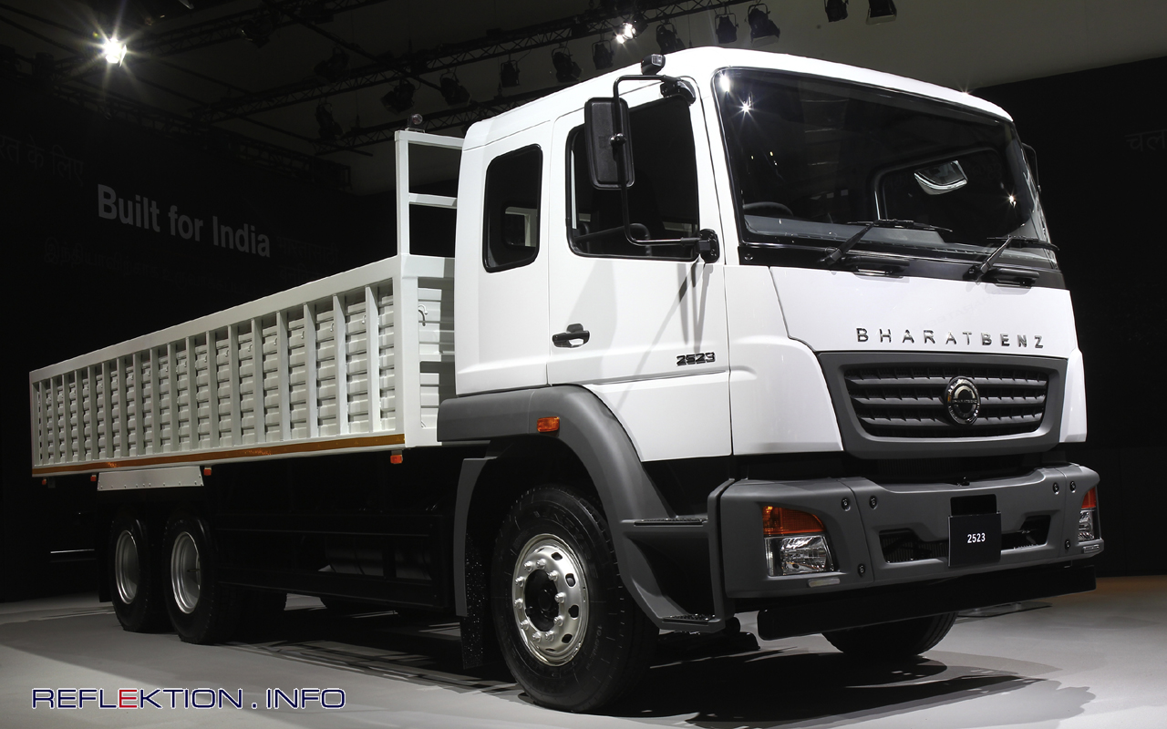 BharatBenz 2523 Daimler stellt seinen ersten Lkw „Made in India“ vor: BharatBenz soll in der indischen Lkw-Branche neue Maßstäbe setzen. Der Transport-Lkw BharatBenz 2523 wird im neuen Werk in Chennai produziert. Er hat einen Sechszylinder-Reihenmotor mit 6,4 l Hubraum und leistet 230 PS mit seinem 6x2 Antrieb. Der 25 Tonnen schwere Lkw hat ein Sechsgang-Getriebe mit Overdrive. Mit BharatBenz steuert die indische Daimler-Tochtergesellschaft Daimler India Commercial Vehicles den indischen Volumen-Lkw-Markt an. Die BharatBenz basieren auf existierenden Plattformen von Daimler Nutzfahrzeugen, sie wurden von indischen Spezialisten für den lokalen Markt entwickelt und werden dort gebaut.