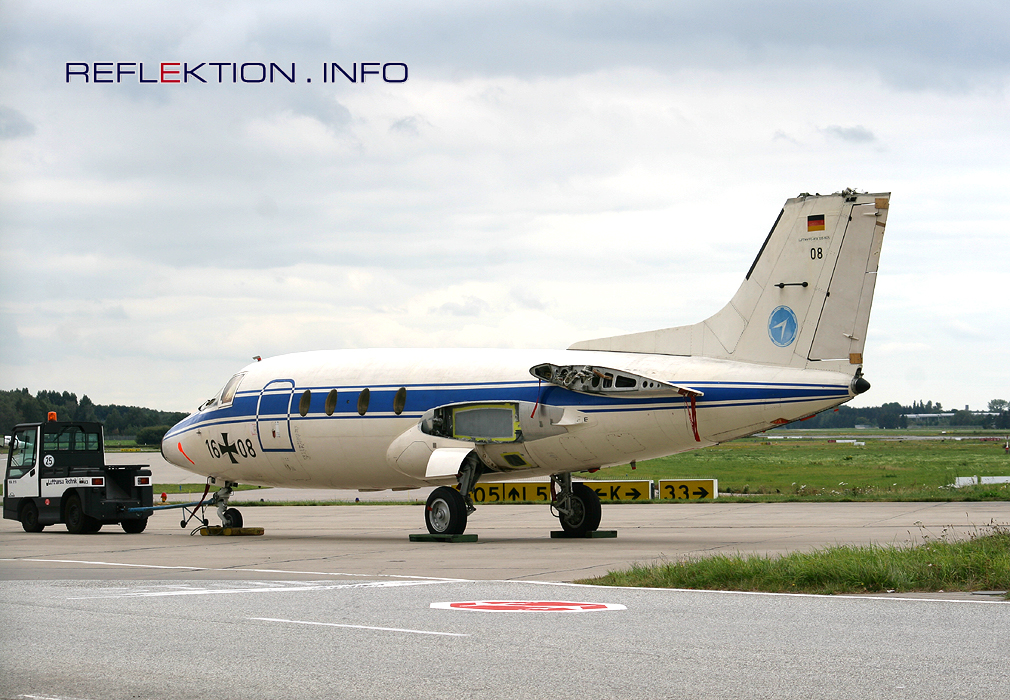 HAMBURGER FLUGZEUGBAU HFB 320 HANSA (ehem. 16+08) Der Hansajet ist das erste deutsche in Serie gebaute Passagierflugzeug. Der Erstflug war bereits 1964. Besonderes Kennzeichen der 320 war die negative Pfeilung (-15°) der Tragflächen. Dadurch konnte die Kabine komfortabel ohne durchlaufende Tragflächenholme gestaltet werden. Nur 47 Maschinen wurden gebaut, davon wurden 14 an die Bundesluftwaffe geliefert. Als Geschäftsreiseflugzeug kam die HFB 320 zu früh. Weltweit ist kein Hansajet mehr im Einsatz, die Bundeswehr hat ihre Exemplare schon 1994 ausgemustert. Der Verein EIN HANSA JET für HAMBURG e.V. konnte im Jahre 2004 den besonders gut erhaltenen und mit 2000 Flugstunden nur wenig genutzten HANSAJET WN 1025 S5 (Baujahr 1967, 5. Serienmaschine) von der Luftwaffe erwerben. Für den Straßentransport von Manching nach Hamburg wurden Tragflächen, Höhenleitwerk und Triebwerke demontiert. Die Wiederherstellung des flugfähigen Zustandes hat jetzt begonnen, jedoch ist ein Abschluß der Arbeiten noch nicht absehbar. Die Wiederzulassung als historisches Flugzeug ist das Ziel des Vereins. Einige Daten: Hersteller: Hamburger Flugzeugbau, Finkenwerder (später MBB, heute AIRBUS) Triebwerk: 2 x General Electric CJ610-1 mit je 13,7 kN Schub Länge: 16,61 m , Höhe: 4,94 m, Spannweite: 14,49 m Leergewicht: 5400 kg, Max. Abfluggewicht: 9200 kg Höchstgeschwindigkeit: 900 km/h, Reisegeschwindigkeit: 825 km/h Dienstgipfelhöhe: 11600 m, Reichweite: 2320 km Crew und Passagiere: 2 + 12 Erstflug: 21. April 1964, FAA-Zulassung 7. April 1967 Kaufpreis: rund 3 Millionen DM