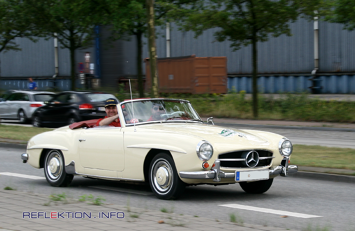MERCEDES-BENZ 190 SL W121BII Von 1955 bis 1963 baute DAIMLER-BENZ knapp 26.000 Fahrzeuge des kleinen SL. 5000 davon blieben in Deutschland, 10.500 wurden in den USA verkauft. 105 PS leistet der 4-Zylinder-Reihenmotor (1897 ccm). Die Höchstgeschwindigkeit beträgt rund 175 km/h. Um die 70.000 Euro sind für ein so schönes Modell wie oben zu bezahlen.