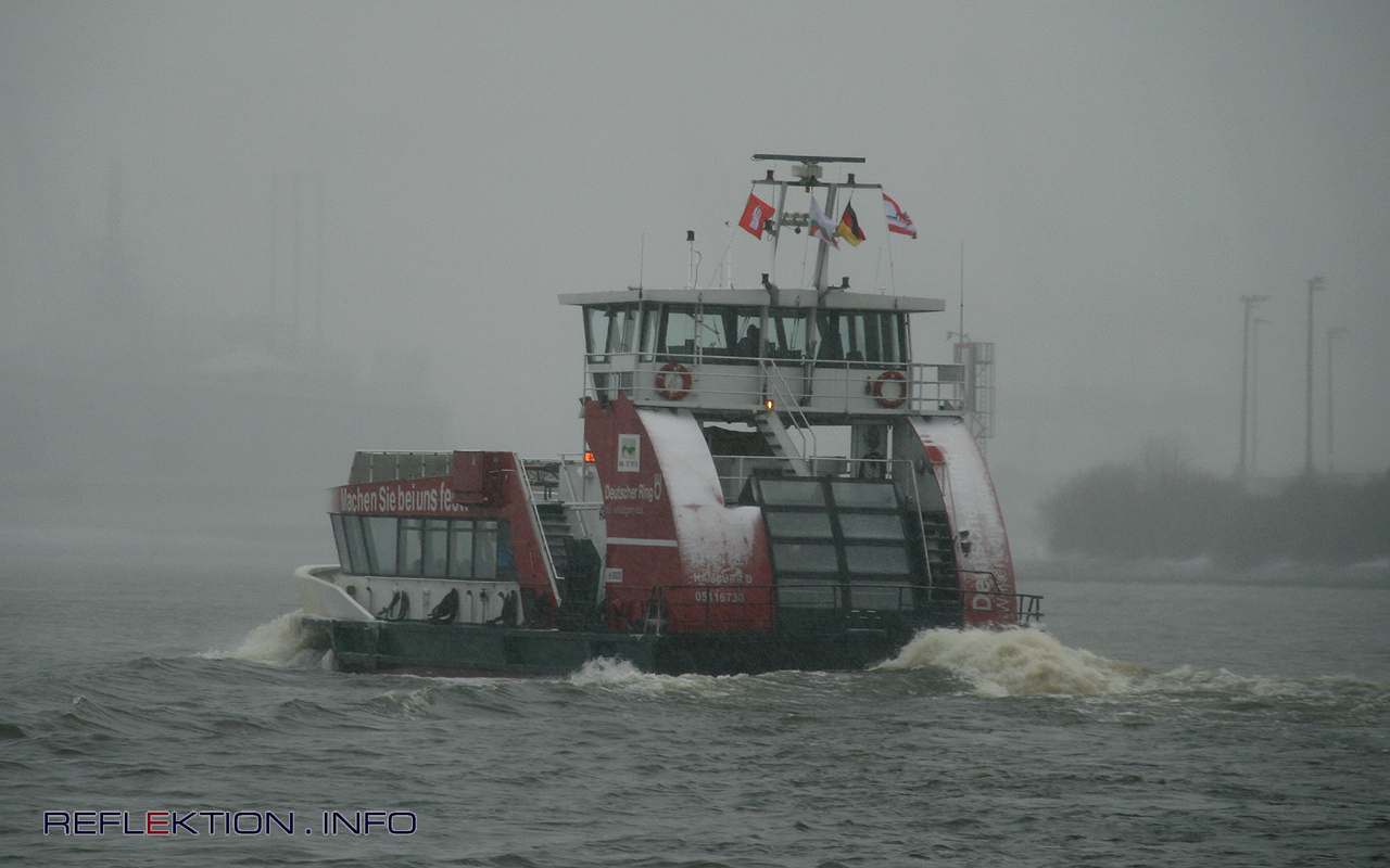 Elbfähre HAFENCITY Der Winter ist da. Etwas früh in diesem Jahr. Aber nicht wirklich überraschend. Schneefall, Minustemperaturen, Nordostwind, Nebel - in summa recht unangenehm in Hamburg. Und so ist das Freideck der Hafenfähre HAFENCITY auf der beliebten Linie 62 absolut leer. Ungewöhnlich, aber durchaus verständlich. Tröstlich wiederum ist die heutige Wintersonnenwende. So werden die Tage ab morgen wieder länger. Zwar langsam, aber unaufhaltsam.