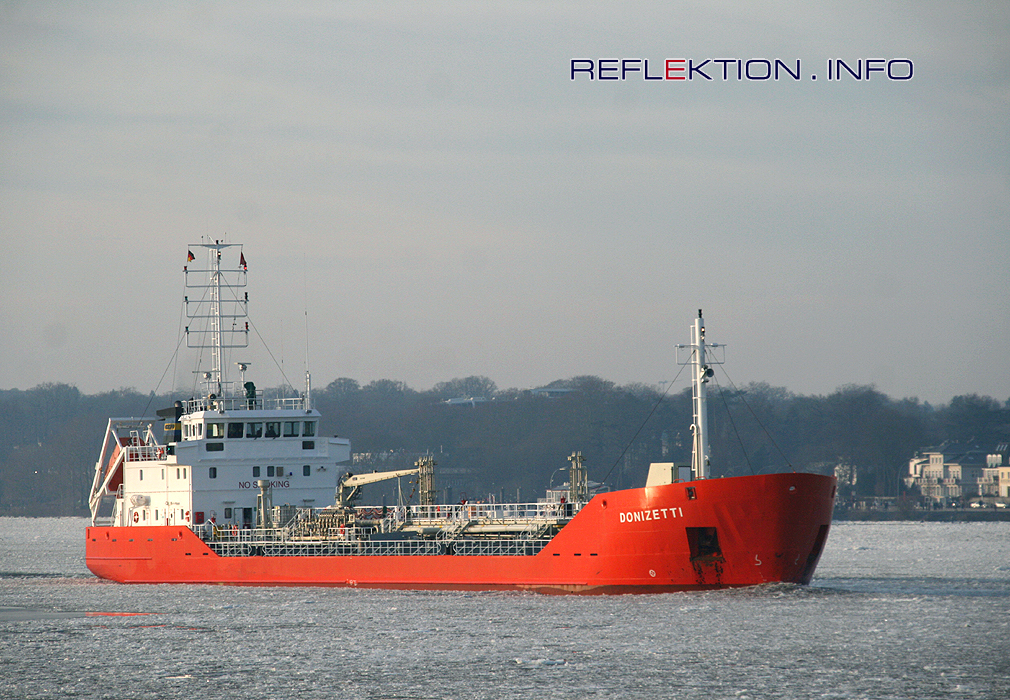 Chemietanker DONIZETTI Bei Eisgang erreicht der Doppelhüllentanker DONIZETTI den Hamburger Hafen. Die DONIZETTI aus dem Jahre 2000 ist 100 Meter lang und 12,50 Meter breit. Das auf der Werft CESKE LODENICE in Tschechien gebaute, 2335 Tonnen große Schiff erreicht eine Geschwindigkeit von maximal 13 Knoten (24 km/h). Registriert ist die DONIZETTI in Luxemburg.