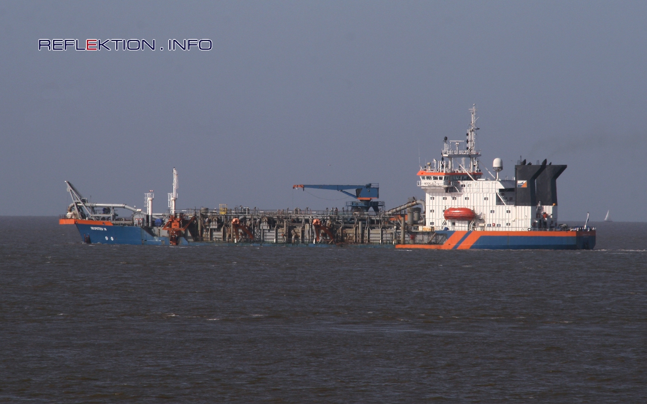Hier arbeitet der Bagger am Rande der Fahrrinne in der Elbmündung vor Cuxhaven.